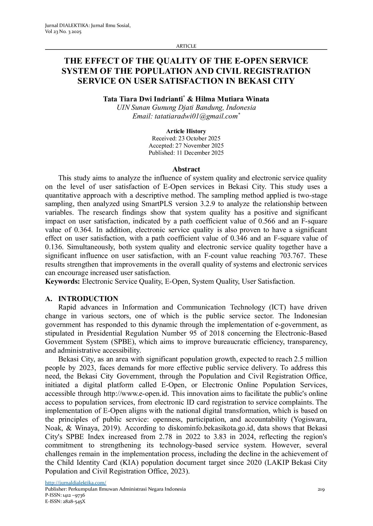 Jurnal Dialektika: Jurnal Ilmu SosialJurnal Dialektika: Jurnal Ilmu SosialPenelitian ini bertujuan untuk menganalisis pengaruh kualitas sistem dan kualitas layanan elektronik terhadap tingkat kepuasan pengguna layanan E-Open di Kota Bekasi. Penelitian ini menggunakan pendekatan kuantitatif dengan metode deskriptif. Metode pengambilan sampel yang diterapkan adalah dua tahap, kemudian dianalisis menggunakan SmartPLS versi 3.2.9 untuk menganalisis hubungan antar variabel. Temuan penelitian menunjukkan bahwa kualitas sistem memiliki dampak positif dan signifikan terhadap kepuasan pengguna, yang ditunjukkan oleh nilai koefisien jalur sebesar 0,566 dan nilai F-square sebesar 0,364. Selain itu, kualitas layanan elektronik juga terbukti berpengaruh signifikan terhadap kepuasan pengguna, dengan nilai koefisien jalur sebesar 0,346 dan nilai F-square sebesar 0,136. Secara simultan, kualitas sistem dan kualitas layanan elektronik bersama-sama memiliki pengaruh signifikan terhadap kepuasan pengguna, dengan nilai F-count mencapai 703,767. Hasil ini menegaskan bahwa peningkatan kualitas keseluruhan sistem dan layanan elektronik dapat mendorong peningkatan kepuasan pengguna.
