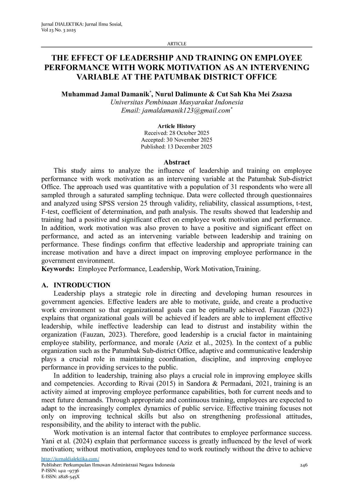 Jurnal Dialektika: Jurnal Ilmu SosialJurnal Dialektika: Jurnal Ilmu SosialPenelitian ini bertujuan untuk menganalisis pengaruh kepemimpinan dan pelatihan terhadap kinerja pegawai dengan motivasi kerja sebagai variabel intervening di Kantor Kecamatan Patumbak. Hasil penelitian menunjukkan bahwa kepemimpinan dan pelatihan memiliki pengaruh positif dan signifikan terhadap motivasi kerja dan kinerja pegawai. Selain itu, motivasi kerja juga terbukti memiliki pengaruh positif dan signifikan terhadap kinerja pegawai dan berperan sebagai variabel intervening antara kepemimpinan dan pelatihan terhadap kinerja pegawai.