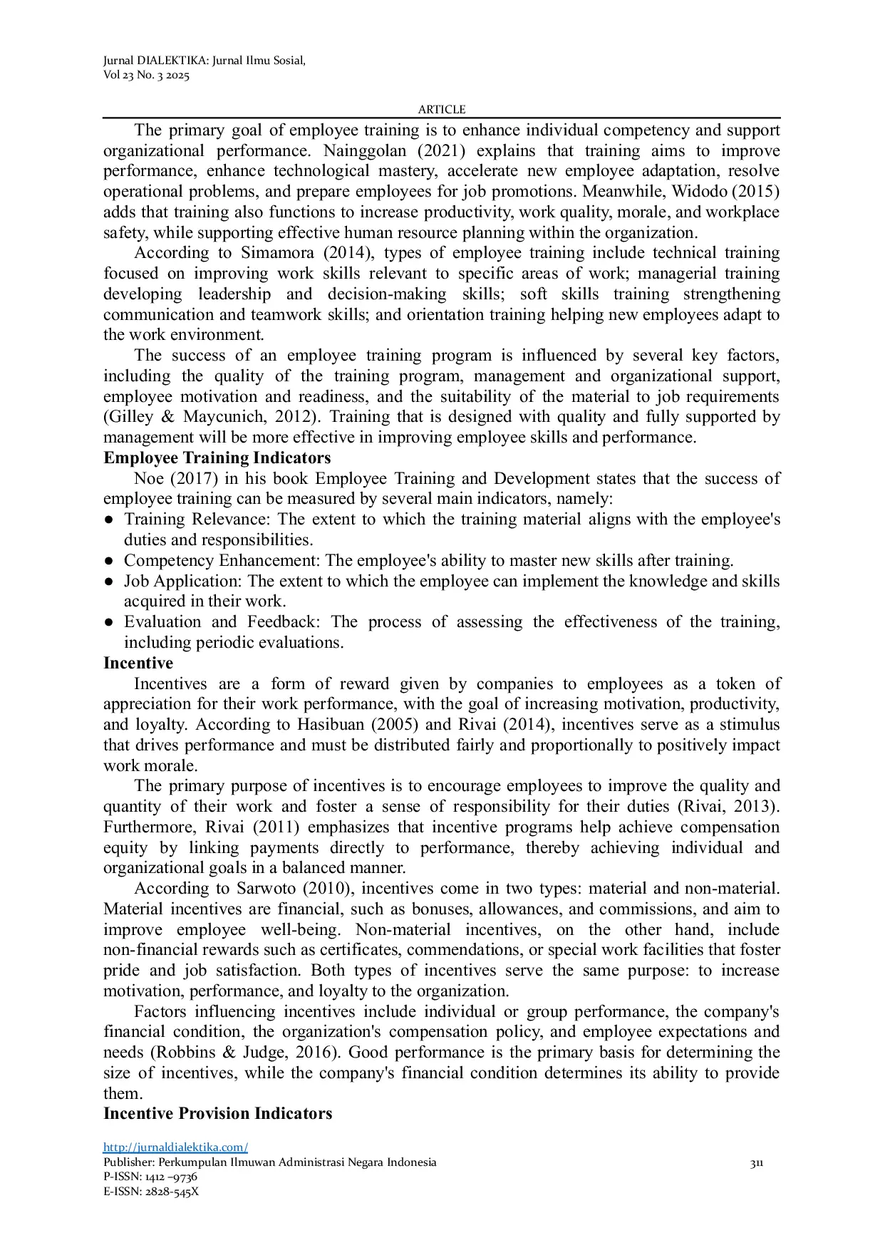 Jurnal Dialektika: Jurnal Ilmu SosialJurnal Dialektika: Jurnal Ilmu SosialPenelitian ini dilakukan untuk menentukan upaya pelatihan karyawan dan pemberian insentif dalam meningkatkan kinerja karyawan melalui pelayanan pelanggan di Kembar Ponsel Medan. Variabel dalam penelitian ini terdiri dari empat variabel independen, yaitu Pelatihan Kerja (X1) dan Insentif (X2), sedangkan variabel dependen adalah Peningkatan Kinerja (Y) dan variabel mediasi adalah Layanan (Z). Metode penelitian yang digunakan adalah pendekatan kuantitatif. Secara simultan, upaya pelatihan karyawan (X1) dan pemberian insentif (X2) memiliki pengaruh positif dan signifikan terhadap peningkatan kinerja (Y). Kombinasi antara pelatihan yang meningkatkan kemampuan dan insentif yang meningkatkan motivasi merupakan strategi yang sangat efektif untuk mencapai kinerja karyawan yang optimal, yaitu nilai F (38,357) lebih besar dari nilai F tabel (3,34) dengan nilai signifikansi (0,000) lebih kecil dari 0,05. Secara simultan, upaya pelatihan karyawan (X1) dan insentif (X2) juga memiliki pengaruh positif dan signifikan terhadap pelayanan pelanggan (Z), dengan nilai F hitung (11,326) lebih besar dari nilai F tabel (3,34) dan nilai signifikansi (0,000) lebih kecil dari 0,05. Hal ini menunjukkan bahwa sinergi antara peningkatan kemampuan (melalui pelatihan) dan motivasi (melalui insentif) menghasilkan kualitas layanan yang lebih tinggi. Pelayanan pelanggan (Z) terbukti berperan sebagai variabel mediasi yang memediasi pengaruh insentif (X2) terhadap peningkatan kinerja (Y). Hal ini berarti bahwa insentif tidak hanya meningkatkan kinerja secara langsung, tetapi juga secara tidak langsung dengan memotivasi karyawan untuk memberikan layanan yang lebih baik, yang pada akhirnya meningkatkan kinerja.