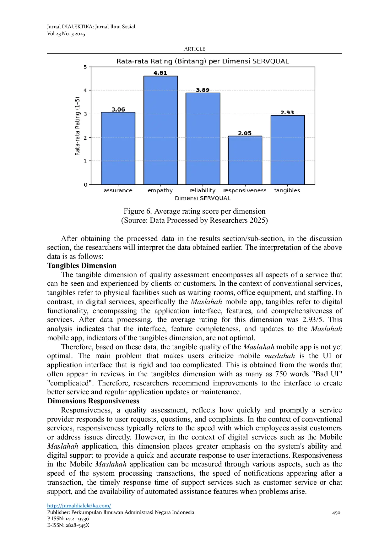 Jurnal Dialektika: Jurnal Ilmu SosialJurnal Dialektika: Jurnal Ilmu SosialThe development of digital services requires Islamic financial institutions to adapt by providing efficient and customer-oriented services. This study aims to analyze the service quality of the Mobile Maslahah application by Bank BJB Syariah using the Service Performance (SERVPERF) approach. This method assesses service quality through five key dimensions: tangibles, reliability, responsiveness, assurance, and empathy. A quantitative method was employed, using web scraping techniques to collect 2,349 user reviews from the Google Playstore platform. The reviews were processed through preprocessing, sentiment analysis, and keyword filtering to classify them into the SERVPERF dimensions. The results show that the empathy dimension achieved the highest average rating (4.61/5), followed by reliability (3.89/5), assurance (3.06/5), tangibles (2.93/5), and responsiveness (2.05/5). These findings indicate that Mobile Maslahah performs strongly in empathy and reliability, while improvements are needed in interface design and system responsiveness. It is recommended that developers enhance the apps usability, system stability, and user support mechanisms to strengthen customer trust and satisfaction.