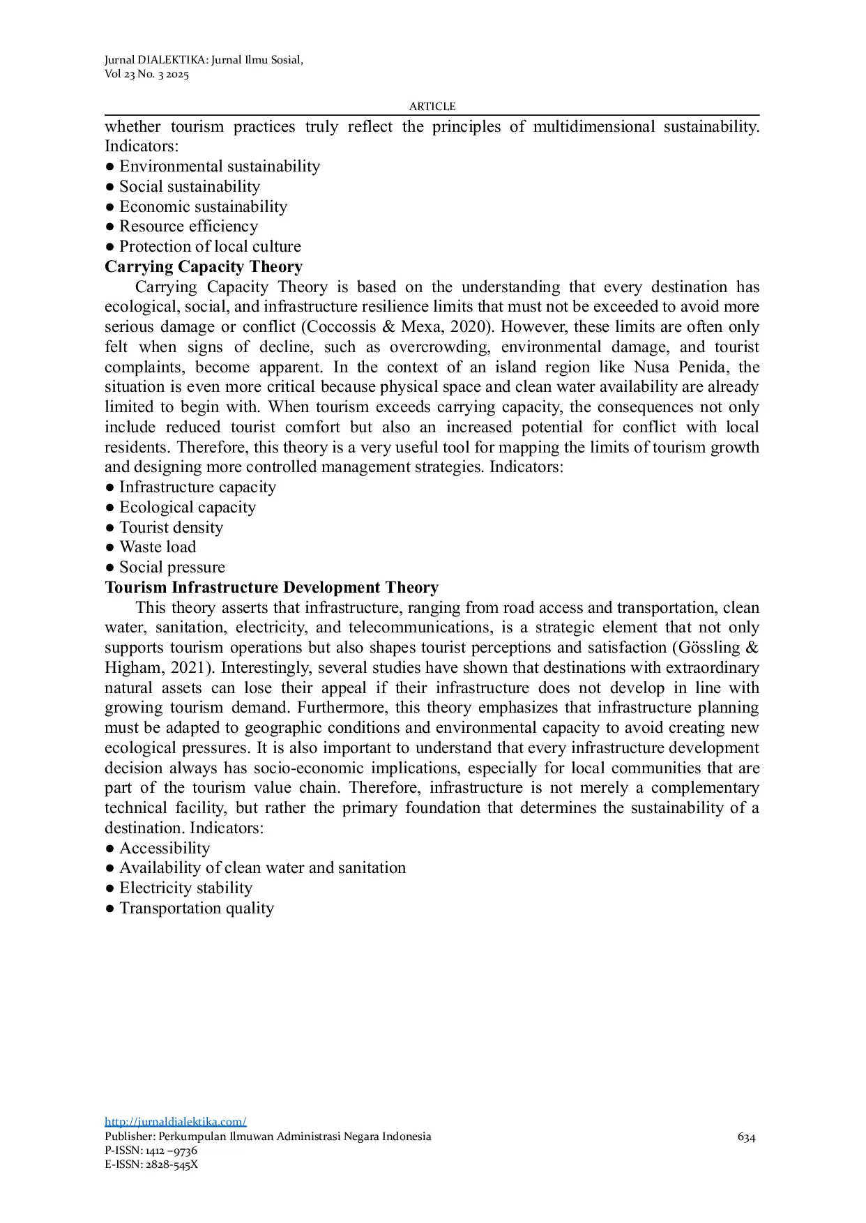 Jurnal Dialektika: Jurnal Ilmu SosialJurnal Dialektika: Jurnal Ilmu SosialPariwisata di Nusa Penida telah berkembang pesat selama dua dekade terakhir, menjadikannya salah satu tujuan terkemuka di Provinsi Bali. Namun, peningkatan kunjungan wisatawan belum diimbangi dengan kesiapan infrastruktur dasar yang memadai seperti jalan, air bersih, listrik, transportasi umum, dan pengelolaan sampah. Studi ini bertujuan untuk menganalisis dampak keterbatasan dan ketidakcukupan infrastruktur terhadap keberlanjutan pariwisata di Nusa Penida. Penelitian ini menggunakan pendekatan kualitatif deskriptif melalui observasi lapangan, wawancara dengan pemangku kepentingan, dan tinjauan pustaka. Temuan menunjukkan bahwa infrastruktur yang tidak memadai telah memberikan tekanan pada lingkungan, mengurangi kualitas pengalaman pengunjung, dan mengancam kesejahteraan masyarakat setempat. Meskipun demikian, inisiatif dari masyarakat setempat dan pemerintah daerah untuk mengembangkan pariwisata berbasis masyarakat menunjukkan arah positif. Studi ini merekomendasikan perencanaan terpadu di antara pemerintah, sektor swasta, dan masyarakat untuk memperkuat infrastruktur dan memastikan tata kelola destinasi yang berkelanjutan.