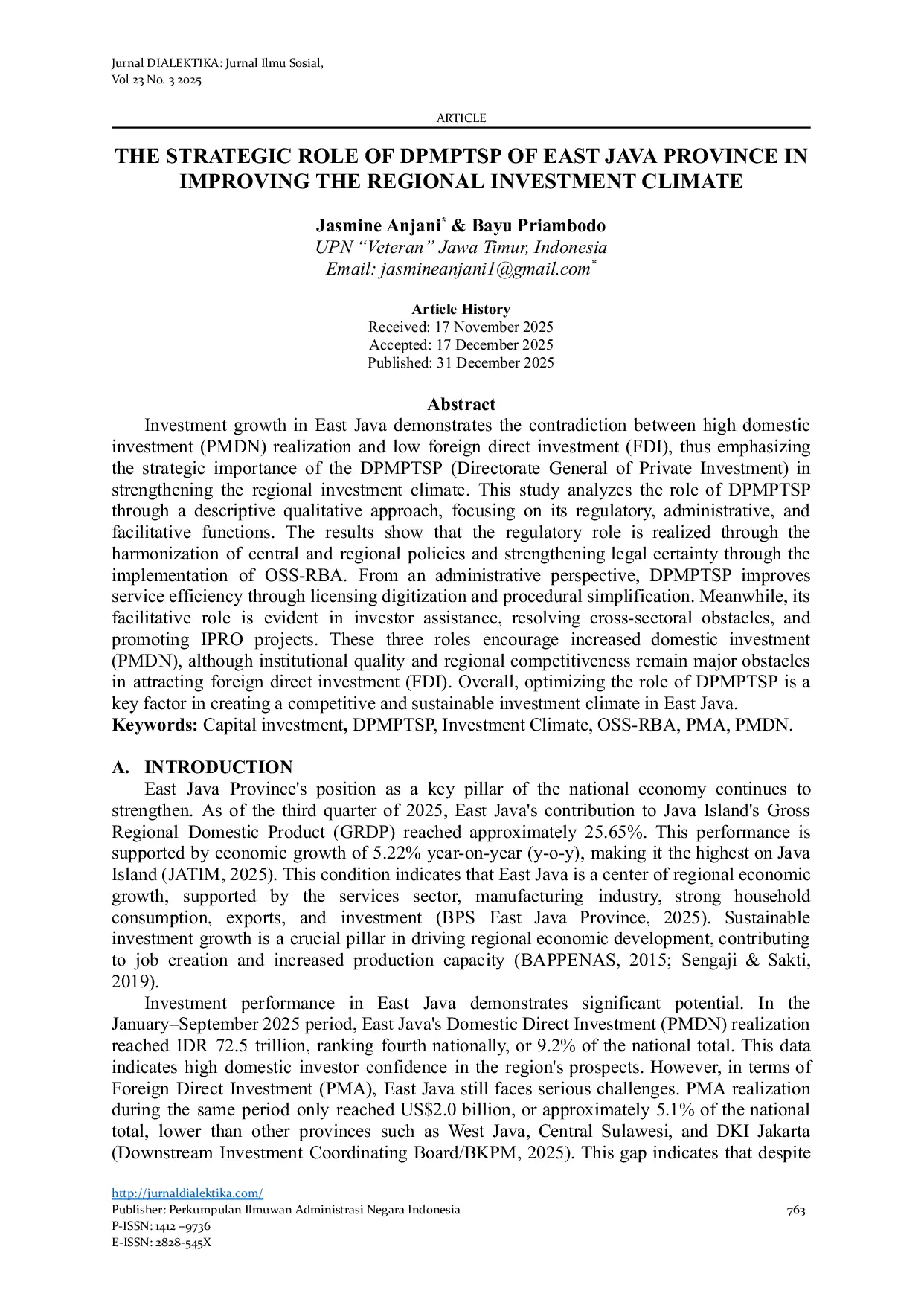 Jurnal Dialektika: Jurnal Ilmu SosialJurnal Dialektika: Jurnal Ilmu SosialPertumbuhan investasi di Jawa Timur menunjukkan kontradiksi antara realisasi investasi domestik (PMDN) yang tinggi dan investasi langsung asing (FDI) yang rendah, sehingga menekankan pentingnya strategis DPMPTSP (Direktorat Jenderal Investasi Swasta) dalam memperkuat iklim investasi regional. Studi ini menganalisis peran DPMPTSP melalui pendekatan kualitatif deskriptif, dengan fokus pada fungsi regulasi, administrasi, dan fasilitasi. Hasil menunjukkan bahwa peran regulasi terealisasi melalui harmonisasi kebijakan pusat dan daerah serta penguatan kepastian hukum melalui implementasi OSS-RBA. Dari sisi administrasi, DPMPTSP meningkatkan efisiensi layanan melalui digitalisasi perizinan dan penyederhanaan prosedur. Sementara itu, peran fasilitasi terlihat dalam bantuan investor, penyelesaian hambatan lintas sektoral, dan promosi proyek IPRO. Ketiga peran ini mendorong peningkatan investasi domestik (PMDN), meskipun kualitas institusi dan daya saing regional tetap menjadi hambatan utama dalam menarik investasi langsung asing (FDI). Secara keseluruhan, optimasi peran DPMPTSP adalah faktor kunci dalam menciptakan iklim investasi yang kompetitif dan berkelanjutan di Jawa Timur.