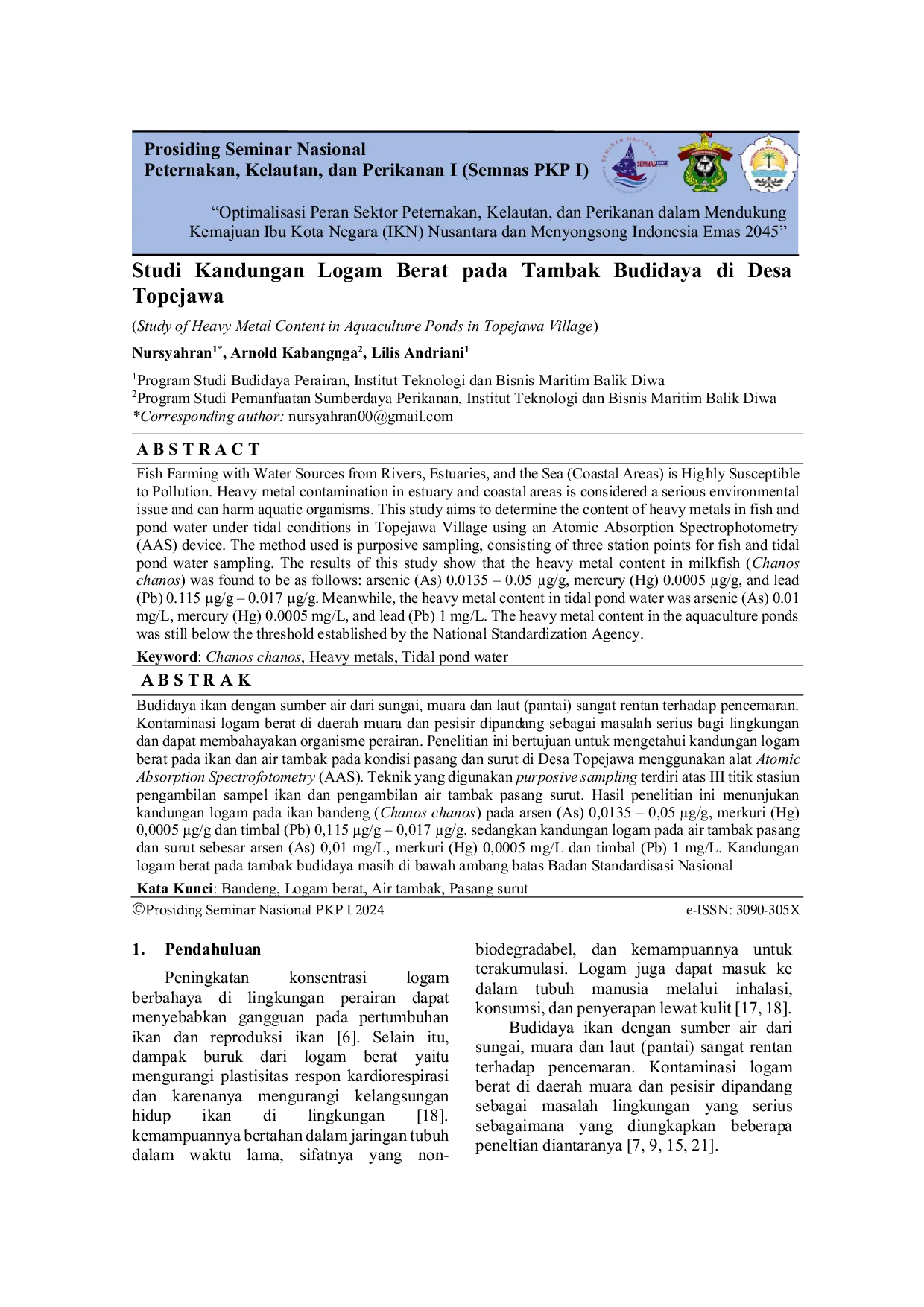 Seminar Nasional Peternakan, Kelautan, dan PerikananSeminar Nasional Peternakan, Kelautan, dan PerikananBudidaya ikan dengan sumber air dari sungai, muara dan laut (pantai) sangat rentan terhadap pencemaran. Kontaminasi logam berat di daerah muara dan pesisir dipandang sebagai masalah serius bagi lingkungan dan dapat membahayakan organisme perairan. Penelitian ini bertujuan untuk mengetahui kandungan logam berat pada ikan dan air tambak pada kondisi pasang dan surut di Desa Topejawa menggunakan alat Atomic Absorption Spectrofotometry (AAS). Teknik yang digunakan purposive sampling terdiri atas III titik stasiun pengambilan sampel ikan dan pengambilan air tambak pasang surut. Hasil penelitian ini menunjukan kandungan logam pada ikan bandeng (Chanos chanos) pada arsen (As) 0,0135 – 0,05 µg/g, merkuri (Hg) 0,0005 µg/g dan timbal (Pb) 0,115 µg/g – 0,017 µg/g. sedangkan kandungan logam pada air tambak pasang dan surut sebesar arsen (As) 0,01 mg/L, merkuri (Hg) 0,0005 mg/L dan timbal (Pb) 1 mg/L. Kandungan logam berat pada tambak budidaya masih di bawah ambang batas Badan Standardisasi Nasional.