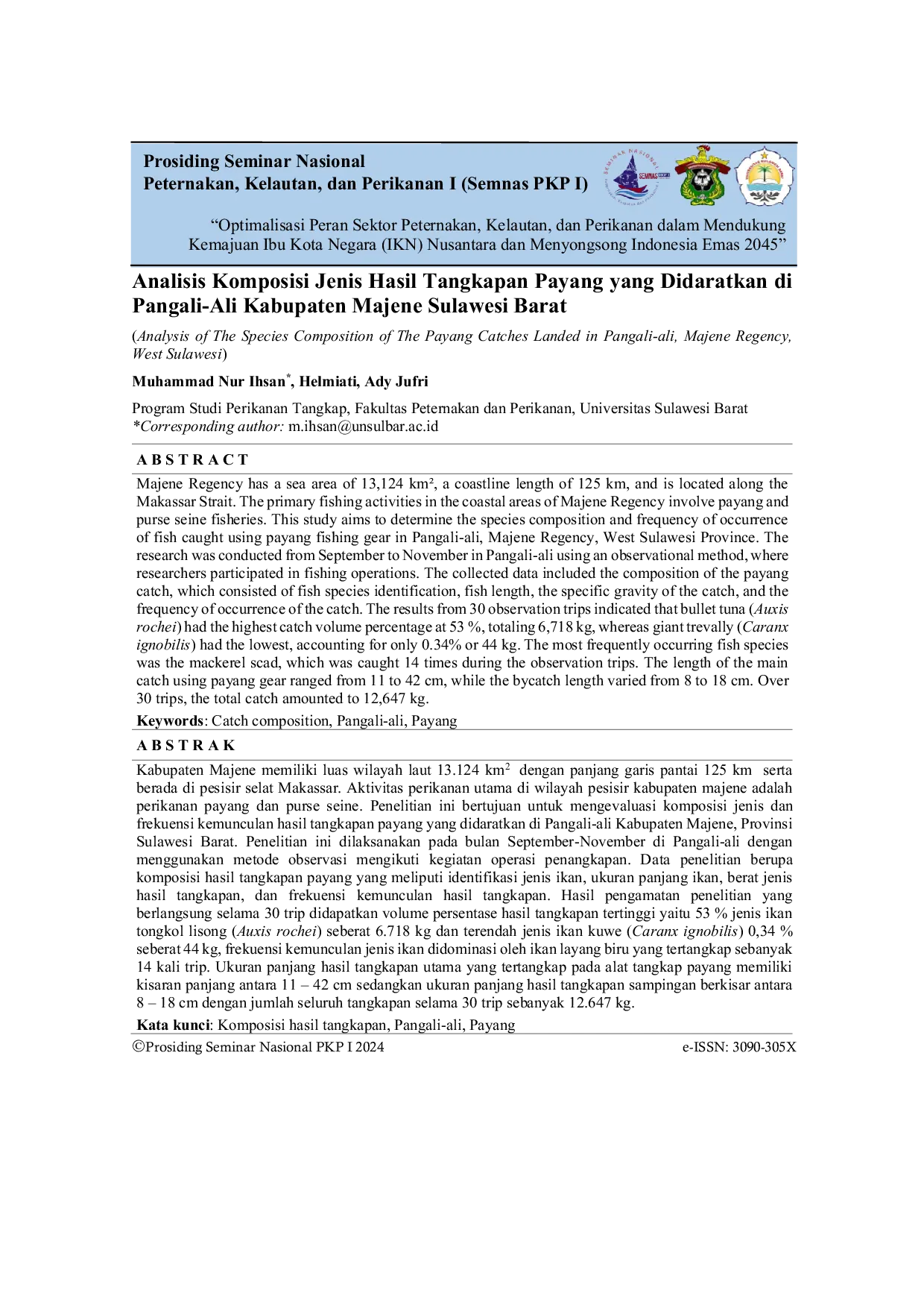 Seminar Nasional Peternakan, Kelautan, dan PerikananSeminar Nasional Peternakan, Kelautan, dan PerikananKabupaten Majene memiliki luas wilayah laut 13.124 km2 dengan panjang garis pantai 125 km2 serta berada di pesisir selat Makassar. Aktivitas perikanan utama di wilayah pesisir kabupaten Majene adalah perikanan payang dan purse seine. Penelitian ini bertujuan untuk mengevaluasi komposisi jenis dan frekuensi kemunculan hasil tangkapan payang yang didaratkan di Pangali-ali Kabupaten Majene, Provinsi Sulawesi Barat. Penelitian ini dilaksanakan pada bulan September-November di Pangali-ali dengan menggunakan metode observasi mengikuti kegiatan operasi penangkapan. Data penelitian berupa komposisi hasil tangkapan payang yang meliputi identifikasi jenis ikan, ukuran panjang ikan, berat jenis hasil tangkapan, dan frekuensi kemunculan hasil tangkapan. Hasil pengamatan penelitian yang berlangsung selama 30 trip didapatkan volume persentase hasil tangkapan tertinggi yaitu 53 % jenis ikan tongkol lisong (Auxis rochei) seberat 6.718 kg dan terendah jenis ikan kuwe (Caranx ignobilis) 0,34 % seberat 44 kg, frekuensi kemunculan jenis ikan didominasi oleh ikan layang biru yang tertangkap sebanyak 14 kali trip. Ukuran panjang hasil tangkapan utama yang tertangkap pada alat tangkap payang memiliki kisaran panjang antara 11 – 42 cm sedangkan ukuran panjang hasil tangkapan sampingan berkisar antara 8 – 18 cm dengan jumlah seluruh tangkapan selama 30 trip sebanyak 12.647 kg.