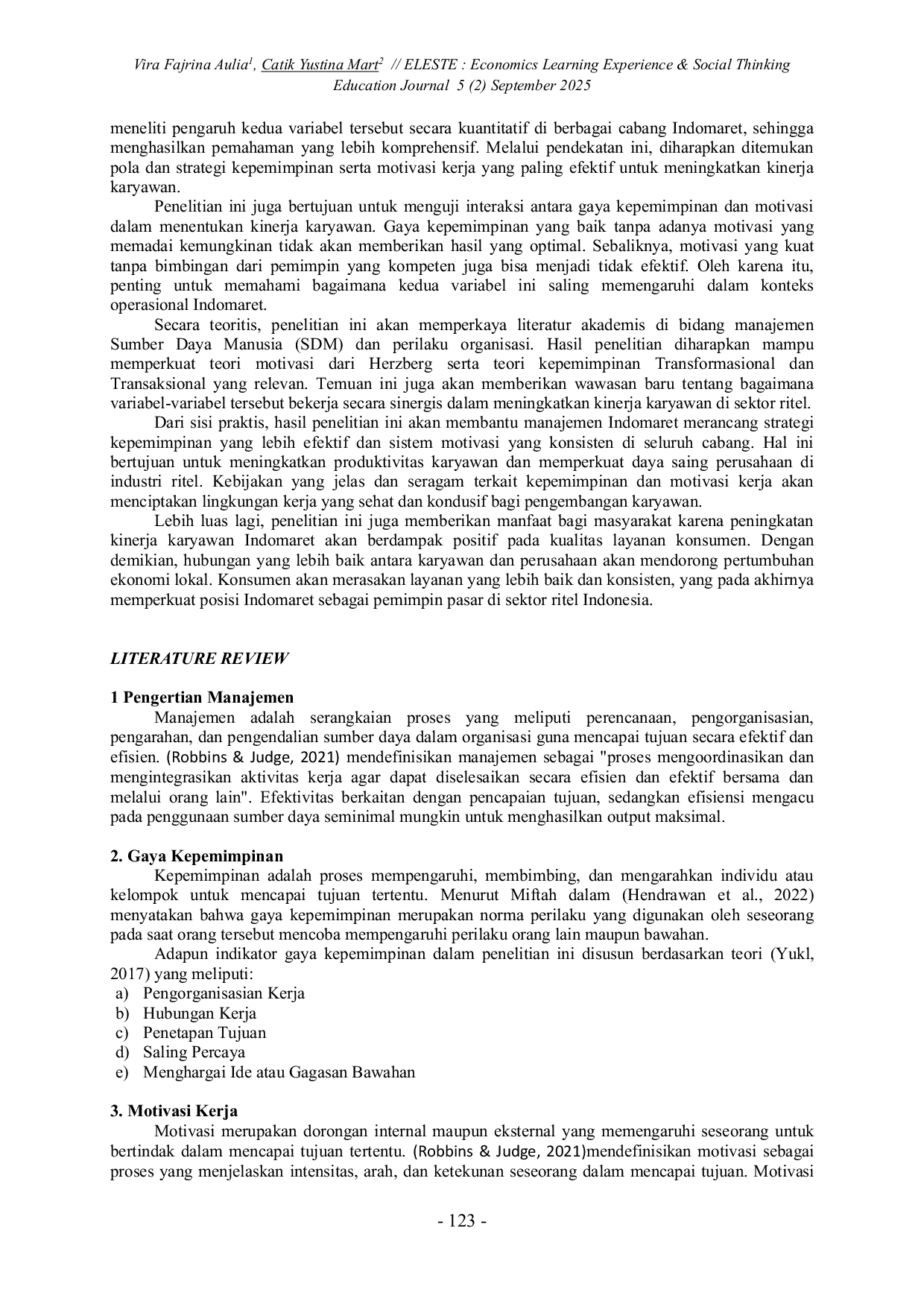 Economics Learning Experience & Social Thinking Education JournalEconomics Learning Experience & Social Thinking Education JournalPenelitian ini bertujuan untuk mengetahui pengaruh gaya kepemimpinan dan motivasi terhadap kinerja karyawan pada Indomaret Fresh Area Bogor 2. Penelitian ini dilandasi oleh pentingnya peran karyawan dalam menunjang kelancaran operasional ritel modern, sehingga dibutuhkan strategi manajerial yang tepat dalam meningkatkan kinerja mereka. Penelitian ini menggunakan pendekatan kuantitatif dengan metode survei melalui penyebaran kuesioner kepada 30 responden yang merupakan karyawan aktif. Hasil penelitian menunjukkan bahwa variabel gaya kepemimpinan (X₁) dan motivasi kerja (X₂) secara simultan berpengaruh signifikan terhadap kinerja karyawan (Y), dengan nilai Fhitung sebesar 24,355 dan signifikansi 0,000. Secara parsial, gaya kepemimpinan memiliki pengaruh signifikan dengan nilai thitung 2,487 (Sig. 0,019), dan motivasi kerja juga berpengaruh signifikan dengan nilai thitung 5,312 (Sig. 0,000). Koefisien determinasi (Adjusted R²) sebesar 0,617 menunjukkan bahwa kedua variabel bebas menjelaskan 61,7% variasi kinerja karyawan. Adapun variabel yang paling dominan memengaruhi kinerja adalah motivasi kerja, dengan nilai beta tertinggi sebesar 0,648. Temuan ini menegaskan pentingnya peran kepemimpinan yang efektif dan sistem motivasi yang terstruktur dalam meningkatkan kinerja karyawan di lingkungan ritel.
