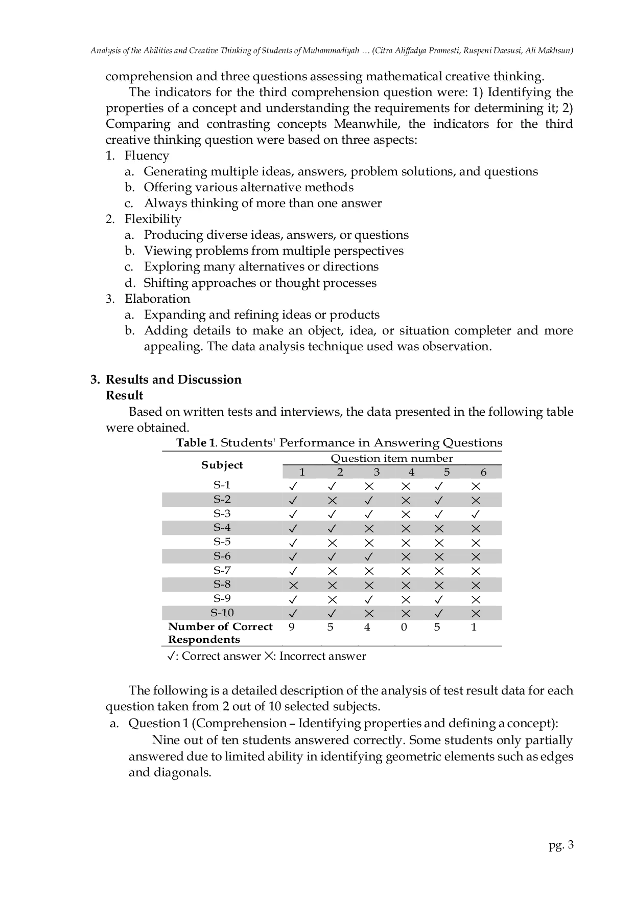 JOELI: Journal of Educational and Learning InnovationJOELI: Journal of Educational and Learning InnovationThis study aims to analyze junior high school students abilities and comprehension of Muhammadiyah 3 Surabaya material on flat-sided spatial structures. This research is descriptive qualitative research. The subjects in this study were junior high school students of Muhammadiyah 3 Surabaya class VIII, selected randomly, namely 10 students. The instrument used in this study was descriptive questions consisting of 6 questions, divided into 3 comprehension questions and 3 creative thinking questions. The results of the research from several students who have been working on questions showing low creative thinking students in understanding and solving questions and flat-sided geometric material because it can be seen from the results that the percentage of student achievement is low. The psychology of students also can affect low understanding ability and students creative thinking.