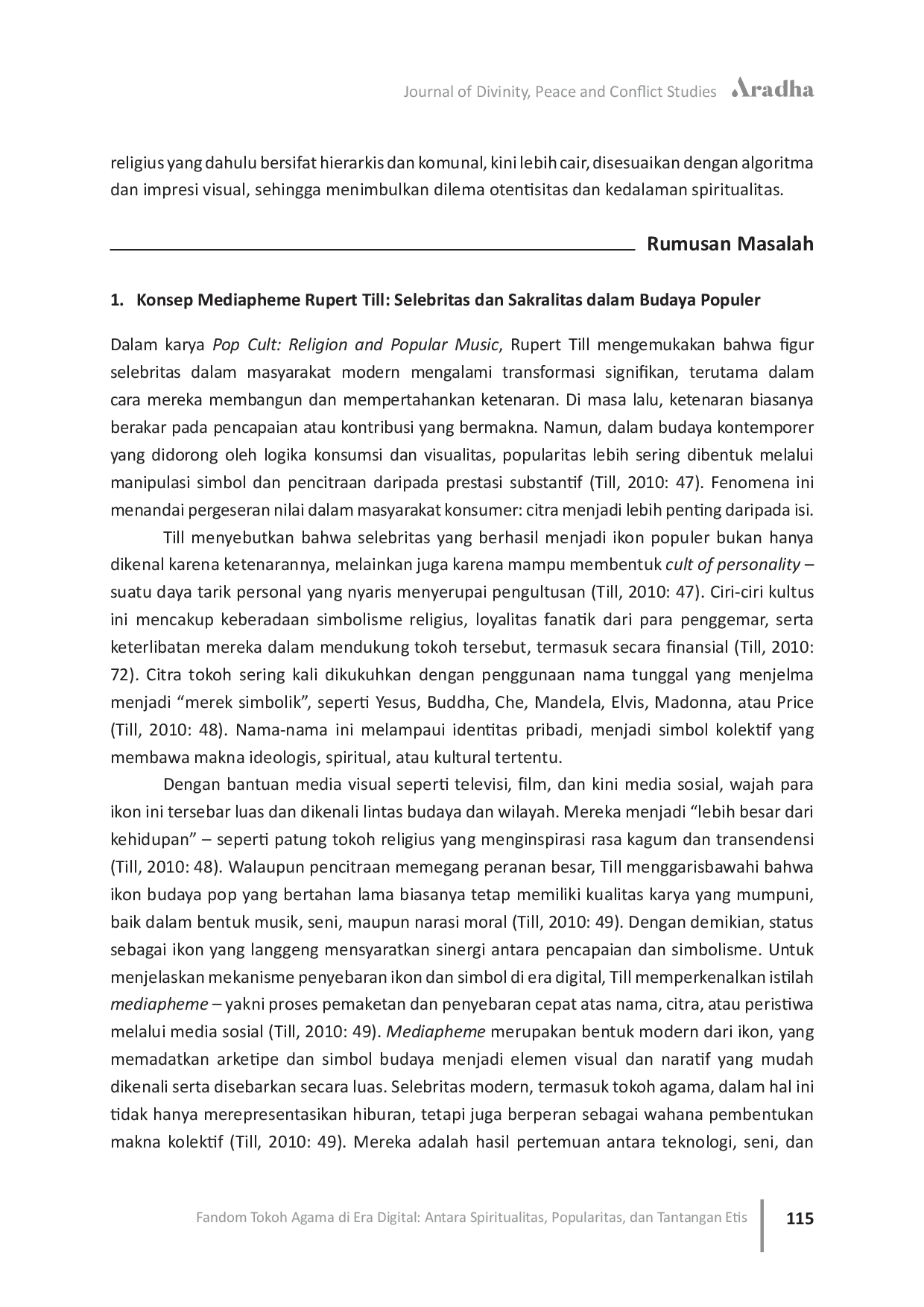 Aradha: Journal of Divinity, Peace and Conflict StudiesAradha: Journal of Divinity, Peace and Conflict StudiesTulisan ini mengkaji fenomena fandom terhadap tokoh agama di era digital dengan pendekatan lintas-disiplin yang menggabungkan teologi publik, etika Kristiani, serta pendekatan korelasional dan praksis dari Gordon Lynch. Fenomena ini menunjukkan pergeseran peran tokoh agama dari pembimbing spiritual menjadi figur publik yang tampil dalam logika budaya populer, melalui konsep mediapheme dan dorongan Fear of Missing Out (FoMo). Mediapheme menjelaskan bagaimana pencitraan dan viralitas membentuk otoritas religius, sementara FOMO menggambarkan tekanan sosial digital yang memengaruhi praktik keagamaan umat dan tokoh agama. Dengan kerangka teologis Lynch, tulisan ini menekankan pentingnya menjaga dimensi normatif, kontekstual, dan dinamis dalam refleksi iman, serta mengajak pembaca untuk melihat budaya populer bukan hanya sebagai tantangan, tetapi juga ruang potensial bagi spiritualitas yang reflektif dan transformatif.
