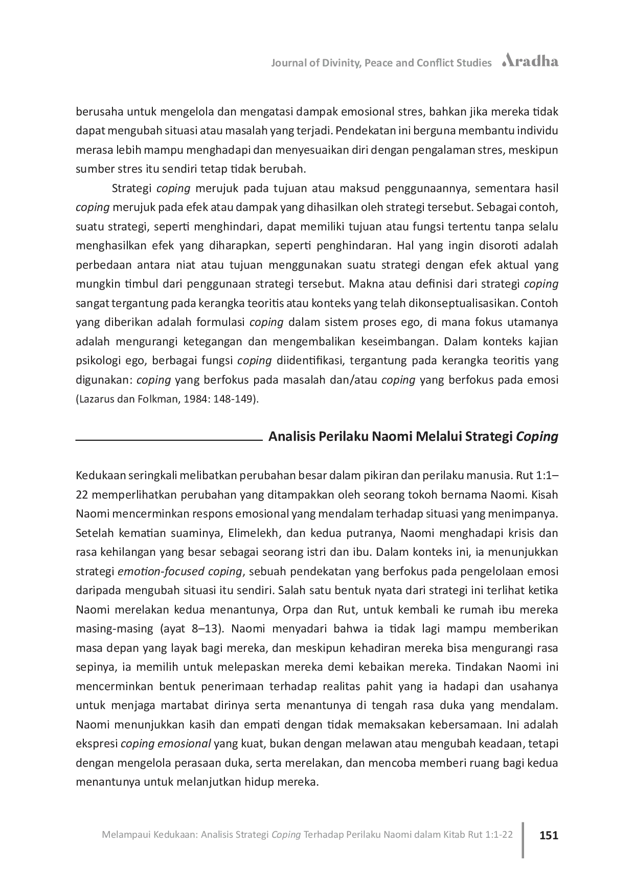 Aradha: Journal of Divinity, Peace and Conflict StudiesAradha: Journal of Divinity, Peace and Conflict StudiesTulisan ini menganalisis tokoh Naomi dalam Kitab Rut 1:1-22 melalui strategi coping yang dikembangkan oleh Richard Lazarus dan Susan Folkman. Naomi, yang mengalami kehilangan suami dan kedua anaknya, menghadapi krisis yang mendalam dan kompleks. Tulisan ini menyoroti bagaimana naomi menerapkan emotion-focused coping, yaitu strategi penanganan stres yang berfokus pada pengelolaan emosi, bukan pada menghilangkan atau mengubah masalah yang menjadi penyebab stres secara langsung. Strategi ini tampak dalam perilaku Naomi yang melepaskan kedua menantunya demi kebaikan mereka dan pengakuan atas perasaannya secara terbuka terhadap peristiwa pahit, dengan menyebut dirinya “Mara. Analisis ini menunjukkan bahwa meskipun Naomi tidak mampu mengubah keadaan tragis yang dialaminya, ia mampu menyalurkan emosinya secara jujur dan menciptakan ruang untuk pemulihan batin. Melalui kisah naomi, coping tidak selalu harus bersifat solutif terhadap masalah, tetapi dapat berupa penerimaan, pengolahan emosi, dan rekonstruksi makna atas peristiwa atau masalah yang dialami. Kisah Naomi juga menjadi refleksi bahwa proses berduka merupakan perjalanan emosional dan kognitif yang dapat mengarah pada pertumbuhan dan transformasi pribadi.