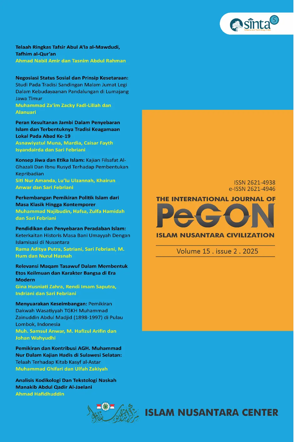 The International Journal of Pegon : Islam Nusantara civilizationThe International Journal of Pegon : Islam Nusantara civilizationPenelitian ini bertujuan menjelaskan peran strategis Kesultanan Jambi dalam penyebaran Islam dan pembentukan tradisi keagamaan lokal pada abad ke-19. Permasalahan utama yang diangkat adalah bagaimana kesultanan memanfaatkan kekuasaan politik, jaringan ulama, serta lembaga keagamaan dalam membentuk pola keberagamaan masyarakat. Hasil penelitian menunjukkan Kesultanan Jambi menerapkan sistem keagamaan terstruktur melalui regulasi pengangkatan imam, pengawasan khutbah, serta kontrol materi ajar berbasis kitab kuning. Tradisi keagamaan yang terbentuk memperlihatkan proses akulturasi antara ajaran Islam dengan adat lokal, seperti ziarah kubur, pembacaan seloko, serta penguatan peran majelis taklim. Penelitian ini memberikan kontribusi bagi pemahaman dinamika Islamisasi lokal di Sumatra, memperlihatkan bahwa kesultanan tidak hanya berperan sebagai pusat kekuasaan politik, melainkan juga sebagai pelaku penting dalam pembentukan identitas keagamaan masyarakat Jambi secara turun-temurun hingga saat ini.