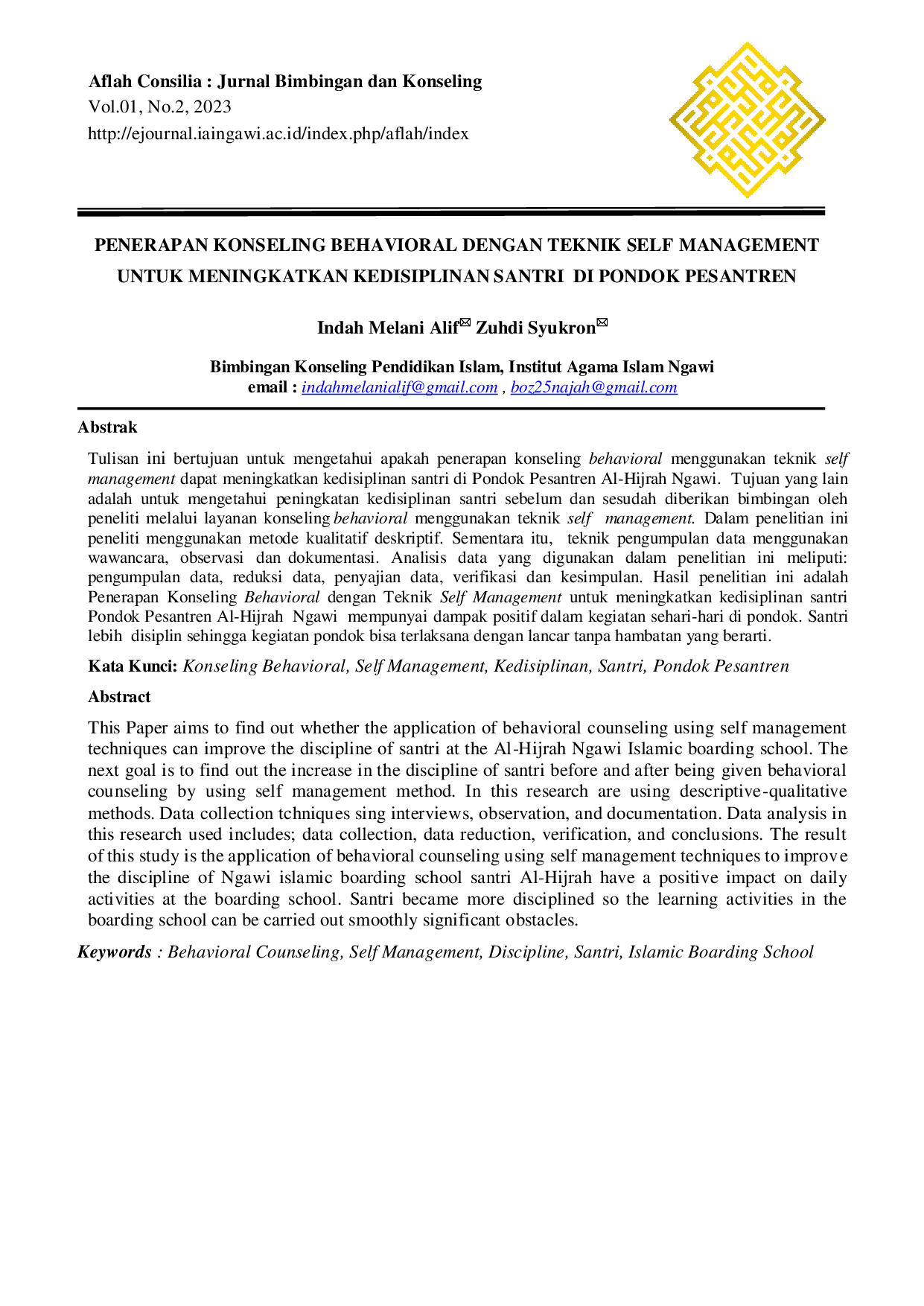 Aflah Consilia: Jurnal Bimbingan dan KonselingAflah Consilia: Jurnal Bimbingan dan KonselingTulisan ini bertujuan untuk mengetahui apakah penerapan konseling behavioral menggunakan teknik self management dapat meningkatkan kedisiplinan santri di Pondok Pesantren Al-Hijrah Ngawi. Tujuan yang lain adalah untuk mengetahui peningkatan kedisiplinan santri sebelum dan sesudah diberikan bimbingan oleh peneliti melalui layanan konseling behavioral menggunakan teknik self management. Dalam penelitian ini peneliti menggunakan metode kualitatif deskriptif. Sementara itu, teknik pengumpulan data menggunakan wawancara, observasi dan dokumentasi. Analisis data yang digunakan dalam penelitian ini meliputi: pengumpulan data, reduksi data, penyajian data, verifikasi dan kesimpulan. Hasil penelitian ini adalah Penerapan Konseling Behavioral dengan Teknik Self Management untuk meningkatkan kedisiplinan santri Pondok Pesantren Al-Hijrah Ngawi mempunyai dampak positif dalam kegiatan sehari-hari di pondok. Santri lebih disiplin sehingga kegiatan pondok bisa terlaksana dengan lancar tanpa hambatan yang berarti.