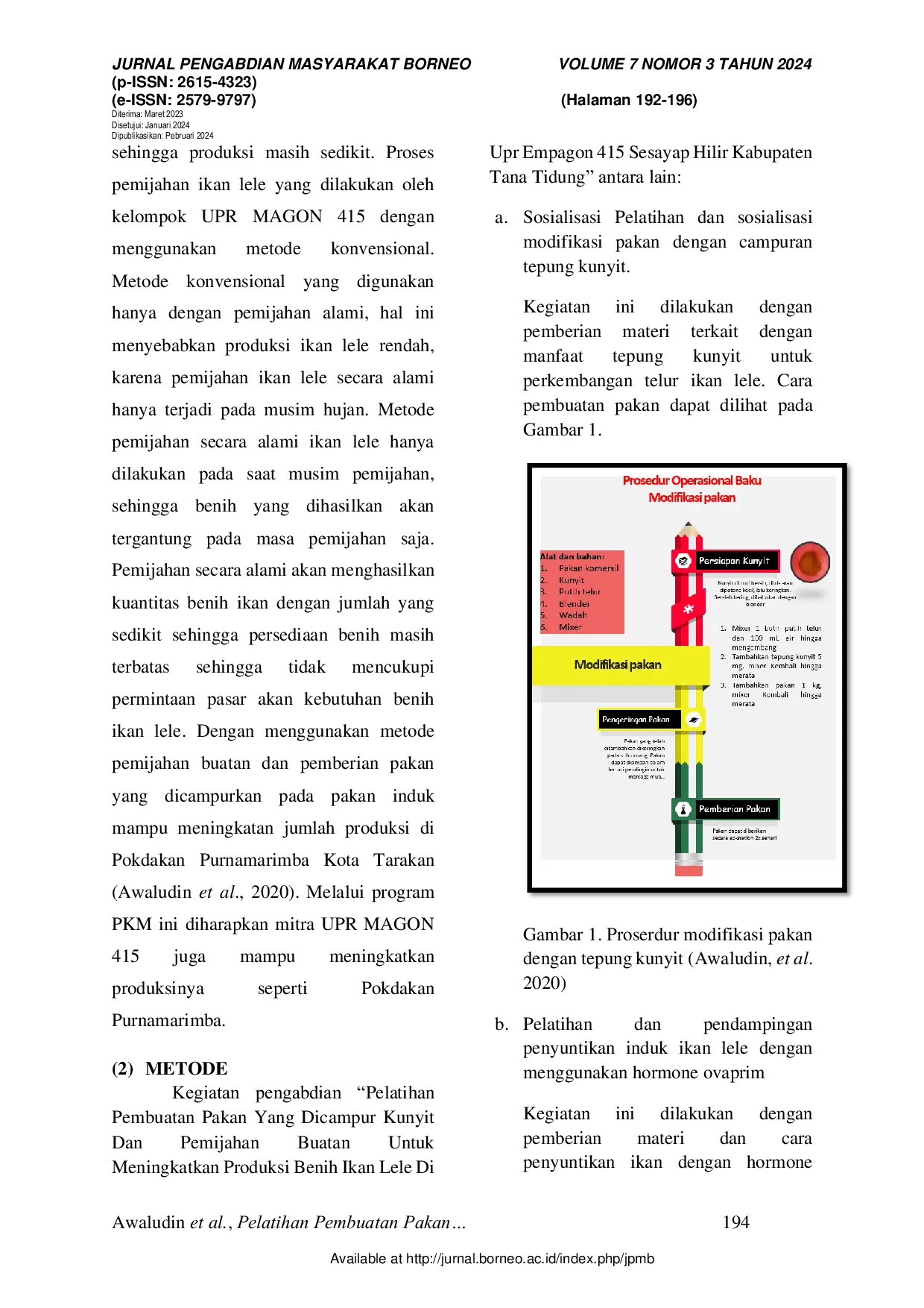 Jurnal Pengabdian Masyarakat BorneoJurnal Pengabdian Masyarakat BorneoIkan lele merupakan salah satu komoditi perikanan yang mengalami peningkatan dalam produksi karena permintaan pasar yang meningkat. Permintaan akan produksi ikan lele di kota Tarakan juga mengalami peningkatan. Meningkatnya permintaan pasar, mendorong upaya dalam produksi ikan lele. Salah satu kunci keberhasilan produksi lele yaitu pada pemijahan, karena pemijahan ikan lele terjadi secara musiman. Untuk menganggulangi ketersedia benih ikan lele maka harus ada alternative teknologi reproduksi untuk pemijahan ikan lele agar dapat terjadi sepanjang tahun. Teknologi rekayasa pemijahan dapat dilakukan dengan kawin suntik menggunakan hormon dan perbaikan kualitas pakan. Pemijahan yang dilakukan oleh para pembudidaya ikan lele (mitra) di Kota Tarakan dengan menggunakan metode pemijahan alami (konvensional) hal ini menyebabkan pemijahan hanya dapat dilakukan pada musim hujan sehingga ketersediaan benih ikan lele menjadi terbatas tergantung dari musim pemijahan saja. Hasil kegiatan ini, mitra telah mampu membuat pakan dengan menambahkan tepung kunyit dan mitra juga telah mampu melakukan pemijahan buatan ikan lele dengan menggunakan hormone ovaprim. Kegiaatan selanjutnya ialah dengan melakukan pemijahan dan menghitung laba dari hasil kegiatan. Diharapkan dengan pelatihan yang akan dilakukan di kelurahan juata kerikil dengan kelompok “Empagon 415 menjadi langkah awal untuk meningkatkan produksi benih ikan lele di kabupaten KTT sepanjang tahun.