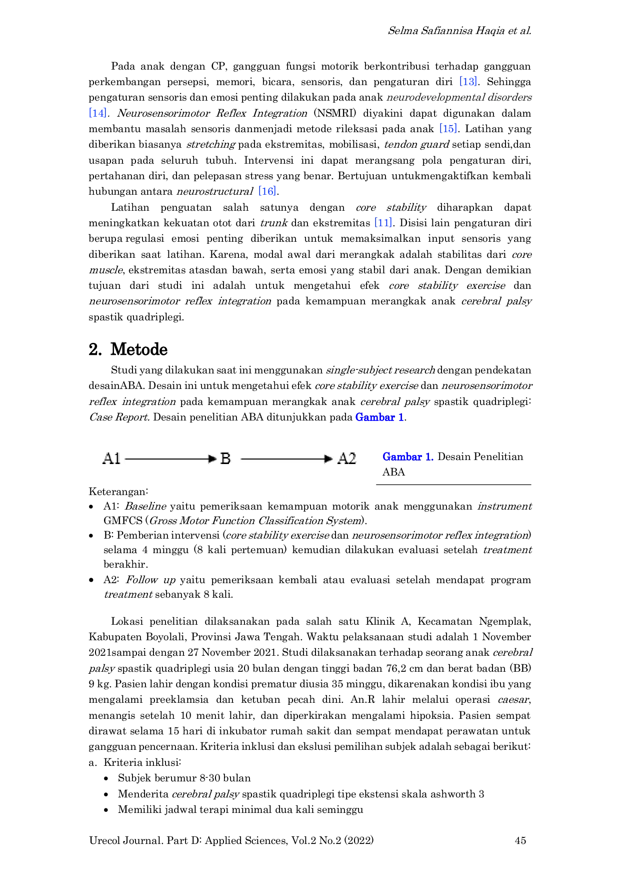 Urecol Journal. Part D: Applied SciencesUrecol Journal. Part D: Applied SciencesPada anak cerebral palsy (cp) latihan core stability menjadi aspek penting yang harus dilakukan sebagai dasar dan persiapan untuk merangkak. Selain itu, neurosensorimotor reflex integration diberikan untuk membantu kontrol emosi agar anak bisa kooperatif saat diberikan latihan. Kedua metode ini diberikan karena dapat mendukung aspek motorik, sensorik, dan kognitif anak diharapkan outcome penelitian dapat tercapai. Untuk mengetahui efek core stability exercise dan neurosensorimotor reflex integration pada kemampuan merangkak anak cerebral palsy spastik quadriplegi. Single subject research yang dilakukan terhadap seorang anak cerebral palsy spastik quadriplegi berumur 20 bulan. Subjek diberikan core stability exercise dan neurosensorimotor reflex integration selama 4 minggu, terapi dilakukan sebanyak 2x/minggu dan dilakukan follow up pengukuran pada perkembangan motorik anak selama 1 bulan. Evaluasi pengukuran motorik anak menggunakan instrumen GMFCS (Gross Motor Function Classification System). Baseline didapatkan belum ada perkembangan signifikan pada kemampuan anak dalam merangkak. Tetapi, di follow up ke 2, anak mampu melakukan gerakan merayap walaupun dengan pola yang kurang sempurna. Gerakan merayap menjadi dasar dalam merangkak. Tidak terdapat peningkatan yang signifikan pada perkembangan motorik anak yaitu merangkak setelah diberikan core stability exercise dan neurosensorimotor reflex integration selama satu bulan.
