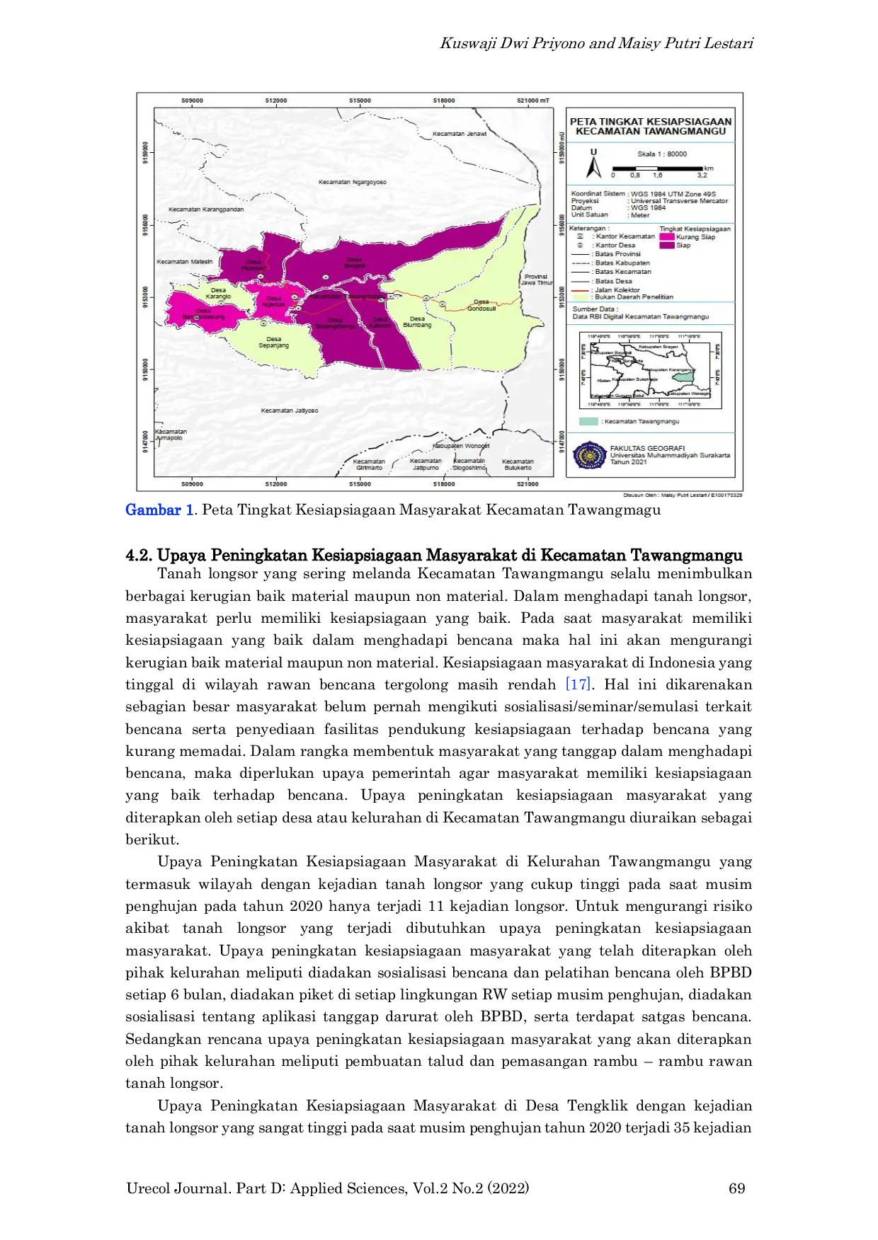 Urecol Journal. Part D: Applied SciencesUrecol Journal. Part D: Applied SciencesKecamatan Tawangmangu merupakan wilayah yang sering terkena longsor pada musim hujan, yang menimbulkan kerugian material dan non‑material bagi masyarakat. Oleh karena itu, diperlukan kesiapsiagaan masyarakat dalam menghadapi bencana longsor serta upaya berkelanjutan untuk meningkatkan kesiapsiagaan tersebut guna mengurangi risiko. Penelitian ini bertujuan untuk (1) menganalisis secara spasial tingkat kesiapsiagaan masyarakat terhadap bahaya longsor di Kecamatan Tawangmangu, dan (2) menelaah upaya pemerintah desa dalam meningkatkan kesiapsiagaan masyarakat terhadap bencana longsor. Metode yang digunakan adalah survei dengan wawancara melalui kuesioner kepada kepala keluarga dan perangkat pemerintah desa di enam desa rawan longsor. Hasil penelitian menunjukkan bahwa tingkat kesiapsiagaan masyarakat berada pada kategori siap di Kelurahan Tawangmangu (skor 16,10), Desa Tengklik (15,42), Desa Plumbon (15,17), dan Kelurahan Kalisoro (13,85), sedangkan kategori kurang siap terdapat di Desa Nglebak (12,36) dan Desa Bandardawung (11,75). Upaya peningkatan kesiapsiagaan bervariasi antar desa, meliputi penyuluhan, piket, pembangunan fasilitas pendukung, pembentukan satgas bencana, serta penggunaan aplikasi tanggap darurat.