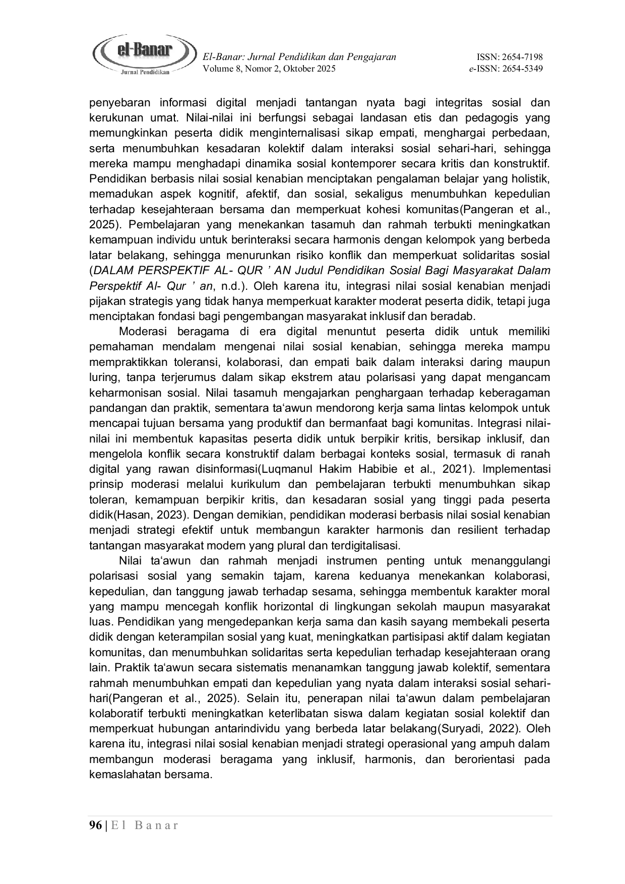 El Banar : Jurnal Pendidikan dan PengajaranEl Banar : Jurnal Pendidikan dan PengajaranFenomena meningkatnya intoleransi, polarisasi sosial, dan degradasi nilai kemanusiaan di era modern menjadi tantangan serius bagi pendidikan Islam. Pendidikan sociality Nabi Muhammad Saw. menawarkan model pendidikan berbasis nilai-nilai sosial profetik yang berorientasi pada keseimbangan dan harmoni sosial. Penelitian ini bertujuan untuk menganalisis nilai-nilai sosial kenabian yang dapat dijadikan landasan konseptual dan praksis dalam memperkuat moderasi beragama di lembaga pendidikan Islam. Metode yang digunakan ialah pendekatan kualitatif deskriptif dengan studi kepustakaan terhadap literatur tafsir, hadis, serta kajian pendidikan Islam klasik dan kontemporer. Hasil penelitian menunjukkan bahwa pendidikan sociality Rasulullah menekankan nilai tasamuh (toleransi), taawun (kerjasama), dan rahmah (kasih sayang), yang diimplementasikan melalui keteladanan, pembiasaan, dan interaksi sosial lintas kelompok. Nilai-nilai tersebut terbukti efektif dalam membangun karakter moderat dan menumbuhkan semangat keberagamaan yang inklusif. Dengan demikian, pendidikan sociality Nabi Muhammad Saw. dapat dijadikan paradigma pendidikan karakter profetik yang relevan untuk memperkuat moderasi beragama di tengah masyarakat digital dan multikultural masa kini.