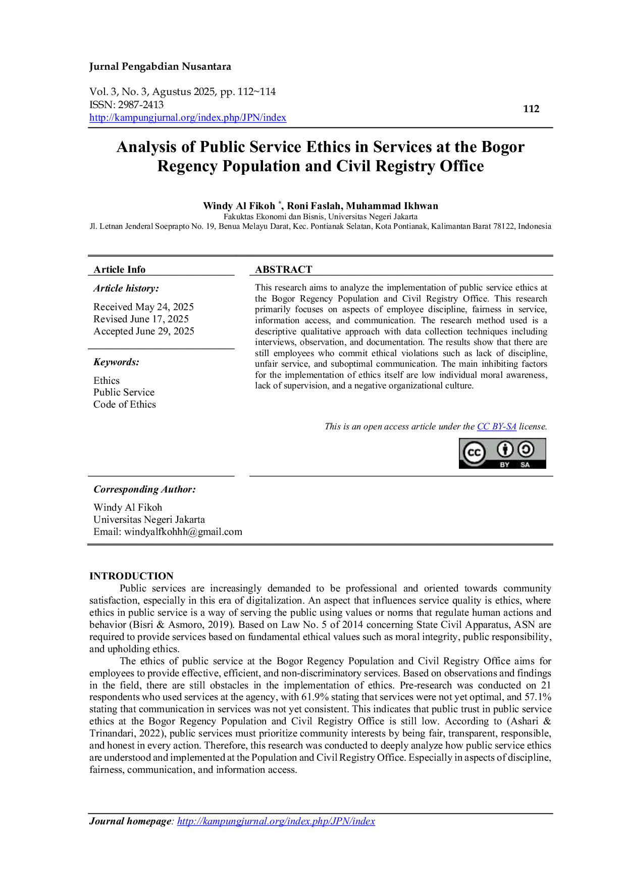 Jurnal Pengabdian NusantaraJurnal Pengabdian NusantaraPenelitian ini bertujuan untuk menganalisis penerapan etika pelayanan publik di Kantor Kependudukan dan Pencatatan Sipil Kabupaten Bogor. Fokus penelitian ini adalah aspek disiplin pegawai, keadilan dalam pelayanan, akses informasi, dan komunikasi. Metode penelitian yang digunakan adalah pendekatan kualitatif deskriptif dengan teknik pengumpulan data berupa wawancara, observasi, dan dokumentasi. Hasil penelitian menunjukkan masih adanya pegawai yang melakukan pelanggaran etika seperti kurang disiplin, pelayanan tidak adil, dan komunikasi yang kurang optimal. Faktor penghambat utama dalam penerapan etika adalah kesadaran moral individu yang rendah, kurangnya pengawasan, dan budaya organisasi yang negatif.
