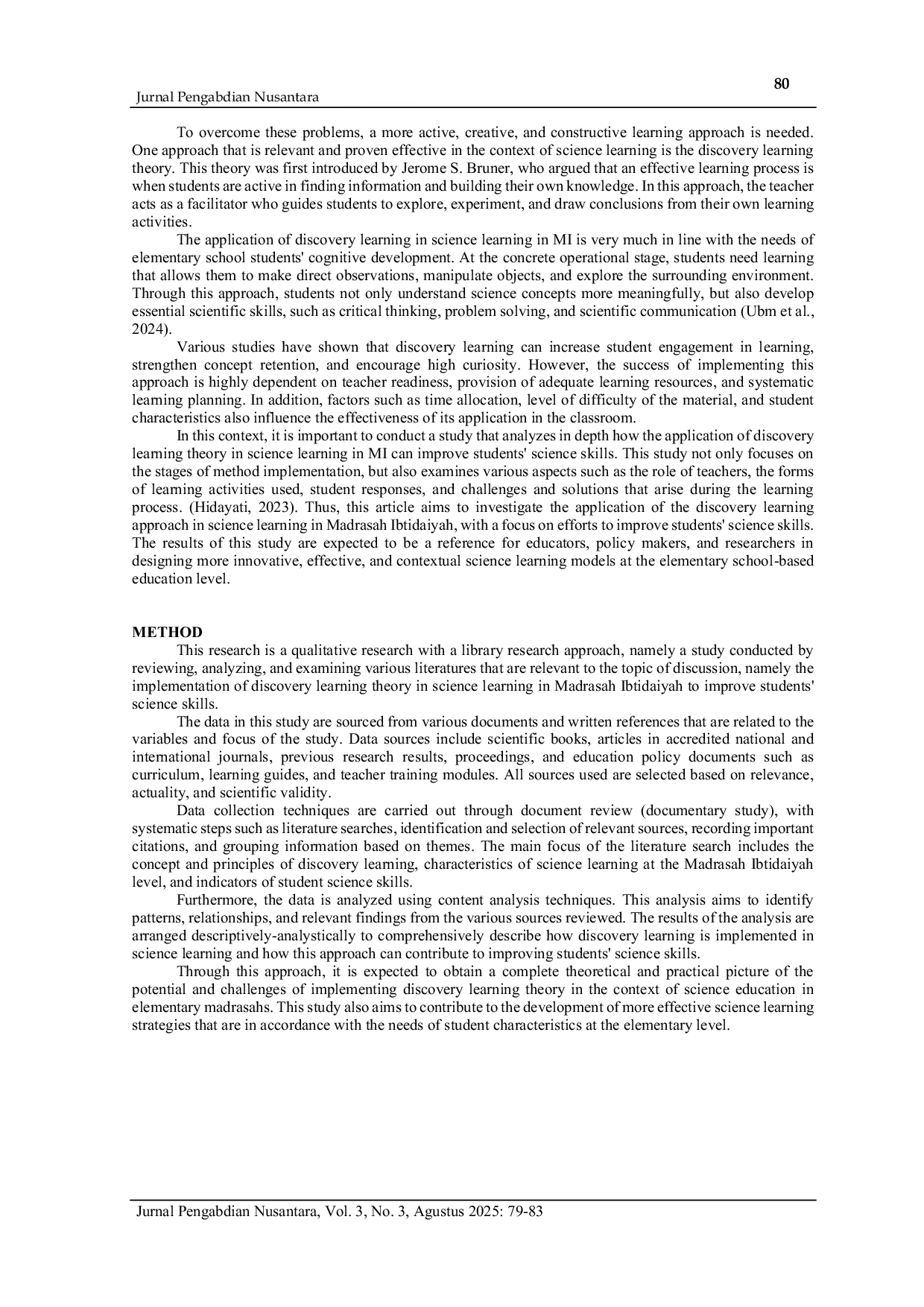 Jurnal Pengabdian NusantaraJurnal Pengabdian NusantaraPenelitian ini memeriksa penerapan teori discovery learning dalam pendidikan sains di Madrasah Ibtidaiyah (MI) dan dampaknya terhadap peningkatan keterampilan sains siswa. Metode penelitian yang digunakan adalah penelitian pustaka dengan meninjau berbagai sumber literatur seperti buku, jurnal, dan artikel ilmiah yang relevan. Hasil menunjukkan bahwa penerapan discovery learning mampu meningkatkan keterampilan proses sains siswa, seperti observasi, klasifikasi, formulasi hipotesis, dan kesimpulan. Implementasi metode ini dilakukan melalui kegiatan eksplorasi, eksperimen sederhana, diskusi kelompok, dan refleksi yang disesuaikan dengan karakteristik siswa di MI. Namun, implementasi discovery learning menghadapi tantangan seperti fasilitas dan infrastruktur terbatas, kemampuan guru yang bervariasi, waktu belajar terbatas, dan kemampuan siswa yang beragam. Untuk mengatasi hambatan ini, diperlukan strategi peningkatan seperti pelatihan guru, pengembangan media pembelajaran sederhana dan kontekstual, dukungan dari pemimpin sekolah, serta integrasi teknologi dan keterlibatan orang tua dalam proses belajar. Secara keseluruhan, discovery learning adalah pendekatan efektif untuk meningkatkan keterampilan sains siswa di MI, asalkan didukung oleh faktor-faktor yang komprehensif dan berkelanjutan.