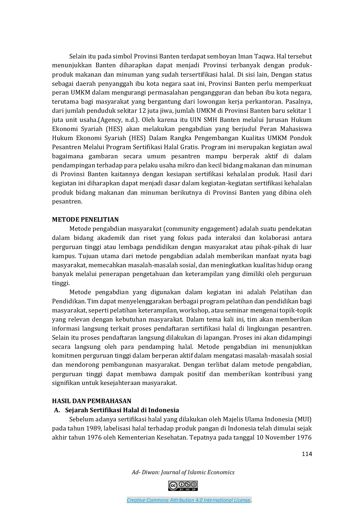 JOURNAL ISLAMIC ECONOMICS AD DIWANJOURNAL ISLAMIC ECONOMICS AD DIWANSebagai negara dengan mayoritas penduduk muslim terbesar di dunia, Indonesia memiliki potensi untuk mejadi pusat industri halal di dunia. Dengan populasi muslim mencapai 85% dari total jumlah penduduk, hal ini bisa menjadi faktor pendukung keberhasilan. Namun kenyatannya hingga saat ini potensi belum terealisasi. Salah satu daerah dengan populasi besar umat muslim di Indonesia adalah Provinsi Banten. Di mana terdapat 4.579 pondok pesantren yg bisa diajak kolaborasi sebagai fasilitator pengembangan halal. Tujuan dari penelitian ini ingin melihat efektifitas kolaborasi antara mahasiswa, pesantren dan UMKM dalam rangka meningkatkan jumlah sertifikasi halal di Banten. Penelitian yang mengkolaborasikan dengan pengabdian ini berupa penyelenggaraan pelatihan dan pendidikan bagi masyarakat, seperti pelatihan keterampilan, workshop, atau seminar mengenai proses pendaftaran sertifikasi halal di lingkungan pesantren. Kegiatan yang didampingi oleh 4 mahasiswa HES, menghasilkan 59 sertifikat halal. Sertifikat tersebut terdiri dari makanan dan minuman. Mulai dari teh, cilok, makanan kekinian dan lain sebagainya. Hasil dari kegiatan ini adalah perlu adanya perhatian jurusan untuk terus mensosialisasikan dan mengedukasi agar para mahasiswa aktif dalam kegiatan tersebut. Secara tidak langsung program ini juga membantu jurusan untuk tracer study mahasiswa yang berdampak pada akreditasi jurusan. Kolaborasi aktif dari berbagai pihak sangat diperlukan. Sehingga memiliki dampak positif bagi mahasiswa jurusan serta para pelaku UMKM.