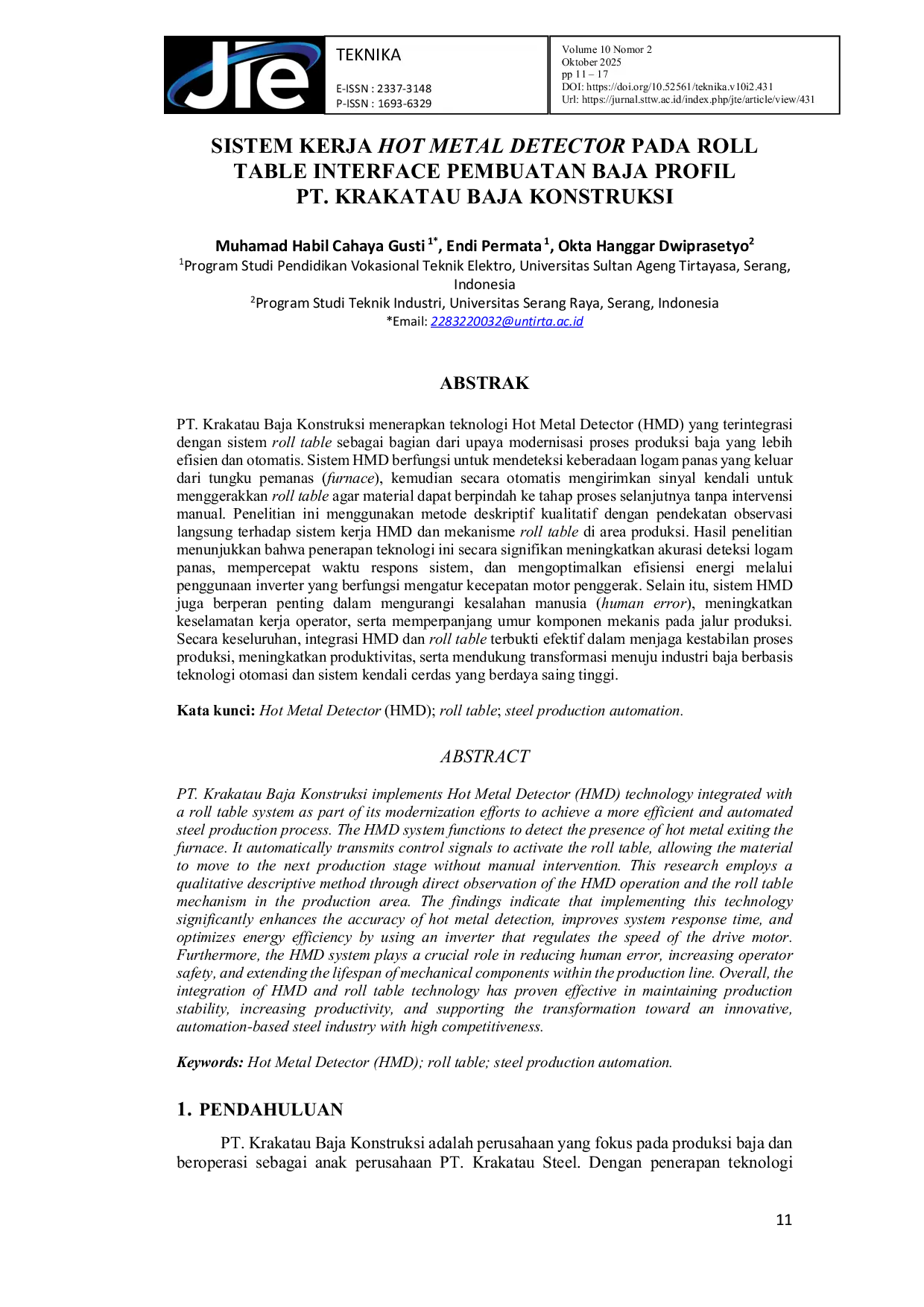 TeknikaTeknikaPT. Krakatau Baja Konstruksi menerapkan teknologi Hot Metal Detector (HMD) yang terintegrasi dengan sistem roll table sebagai bagian dari upaya modernisasi proses produksi baja yang lebih efisien dan otomatis. Sistem HMD berfungsi untuk mendeteksi keberadaan logam panas yang keluar dari tungku pemanas (furnace), kemudian secara otomatis mengirimkan sinyal kendali untuk menggerakkan roll table agar material dapat berpindah ke tahap proses selanjutnya tanpa intervensi manual. Penelitian ini menggunakan metode deskriptif kualitatif dengan pendekatan observasi langsung terhadap sistem kerja HMD dan mekanisme roll table di area produksi. Hasil penelitian menunjukkan bahwa penerapan teknologi ini secara signifikan meningkatkan akurasi deteksi logam panas, mempercepat waktu respons sistem, dan mengoptimalkan efisiensi energi melalui penggunaan inverter yang berfungsi mengatur kecepatan motor penggerak. Selain itu, sistem HMD juga berperan penting dalam mengurangi kesalahan manusia (human error), meningkatkan keselamatan kerja operator, serta memperpanjang umur komponen mekanis pada jalur produksi. Secara keseluruhan, integrasi HMD dan roll table terbukti efektif dalam menjaga kestabilan proses produksi, meningkatkan produktivitas, serta mendukung transformasi menuju industri baja berbasis teknologi otomasi dan sistem kendali cerdas yang berdaya saing tinggi.
