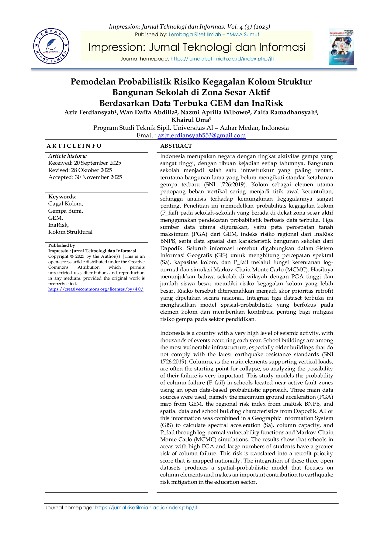Impression : Jurnal Teknologi dan InformasiImpression : Jurnal Teknologi dan InformasiIndonesia merupakan negara dengan tingkat aktivitas gempa yang sangat tinggi, dengan ribuan kejadian setiap tahunnya. Bangunan sekolah menjadi salah satu infrastruktur yang paling rentan, terutama bangunan lama yang belum mengikuti standar ketahanan gempa terbaru (SNI 1726:2019). Kolom sebagai elemen utama penopang beban vertikal sering menjadi titik awal keruntuhan, sehingga analisis terhadap kemungkinan kegagalannya sangat penting. Penelitian ini memodelkan probabilitas kegagalan kolom (P_fail) pada sekolah-sekolah yang berada di dekat zona sesar aktif menggunakan pendekatan probabilistik berbasis data terbuka. Tiga sumber data utama digunakan, yaitu peta percepatan tanah maksimum (PGA) dari GEM, indeks risiko regional dari InaRisk BNPB, serta data spasial dan karakteristik bangunan sekolah dari Dapodik. Seluruh informasi tersebut digabungkan dalam Sistem Informasi Geografis (GIS) untuk menghitung percepatan spektral (Sa), kapasitas kolom, dan P_fail melalui fungsi kerentanan log-normal dan simulasi Markov-Chain Monte Carlo (MCMC). Hasilnya menunjukkan bahwa sekolah di wilayah dengan PGA tinggi dan jumlah siswa besar memiliki risiko kegagalan kolom yang lebih besar. Risiko tersebut diterjemahkan menjadi skor prioritas retrofit yang dipetakan secara nasional. Integrasi tiga dataset terbuka ini menghasilkan model spasial-probabilistik yang berfokus pada elemen kolom dan memberikan kontribusi penting bagi mitigasi risiko gempa pada sektor pendidikan.