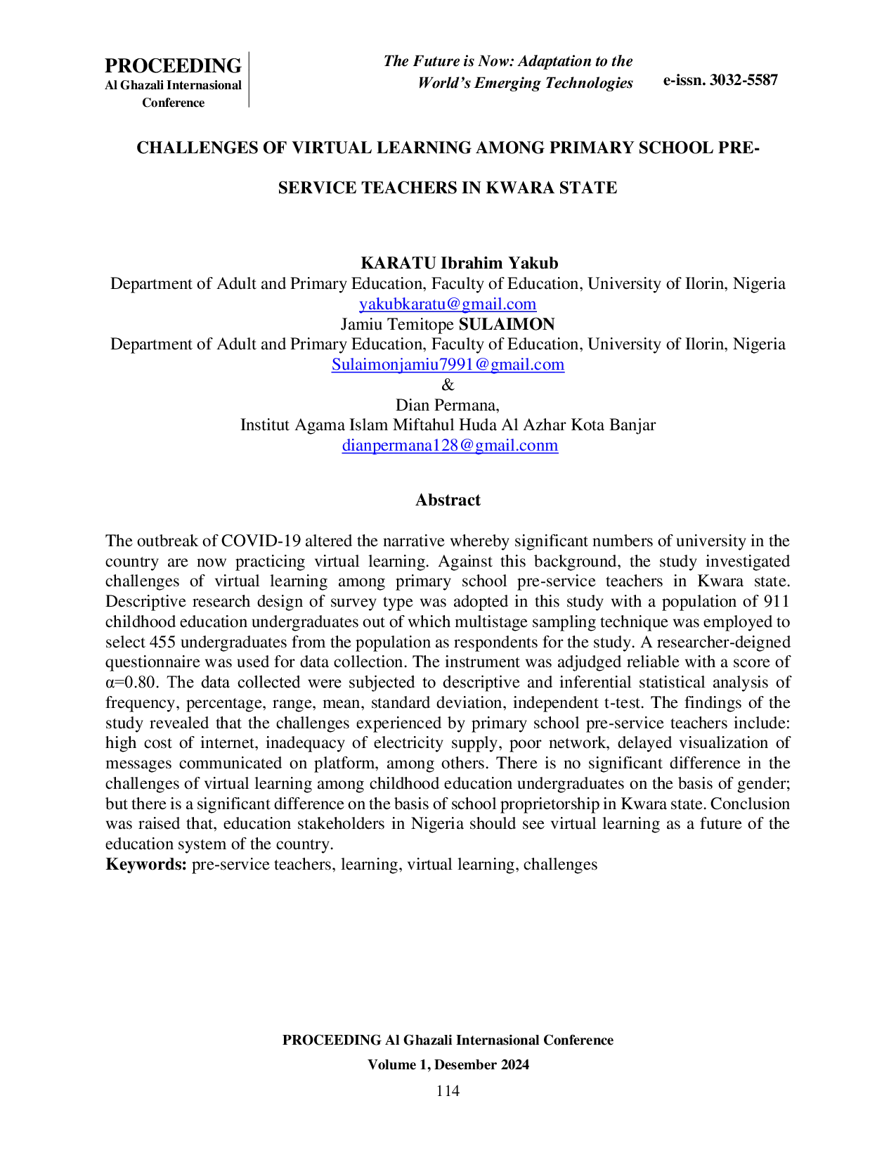 PROCEEDING AL GHAZALI International ConferencePROCEEDING AL GHAZALI International ConferencePenelitian ini menyelidiki tantangan pembelajaran virtual di antara guru calon guru sekolah dasar di negara bagian Kwara. Penelitian ini mengadopsi desain penelitian survei deskriptif dengan populasi 911 mahasiswa pendidikan anak usia dini, di mana teknik pengambilan sampel bertahap digunakan untuk memilih 455 mahasiswa dari populasi sebagai responden penelitian. Kuesioner yang dirancang oleh peneliti digunakan untuk pengumpulan data. Instrumen tersebut dinilai andal dengan skor α=0,80. Analisis statistik deskriptif dan inferensial frekuensi, persentase, rentang, mean, standar deviasi, dan uji-t independen diterapkan pada data yang dikumpulkan. Temuan penelitian mengungkapkan bahwa tantangan yang dialami oleh guru calon guru sekolah dasar meliputi: biaya internet yang tinggi, ketidakcukupan pasokan listrik, jaringan yang buruk, keterlambatan visualisasi pesan yang dikomunikasikan di platform, dan lain-lain. Tidak ada perbedaan signifikan dalam tantangan pembelajaran virtual di antara mahasiswa pendidikan anak usia dini berdasarkan jenis kelamin; tetapi ada perbedaan signifikan berdasarkan kepemilikan sekolah di negara bagian Kwara. Kesimpulan menyatakan bahwa pemangku kepentingan pendidikan di Nigeria harus melihat pembelajaran virtual sebagai masa depan sistem pendidikan negara tersebut.