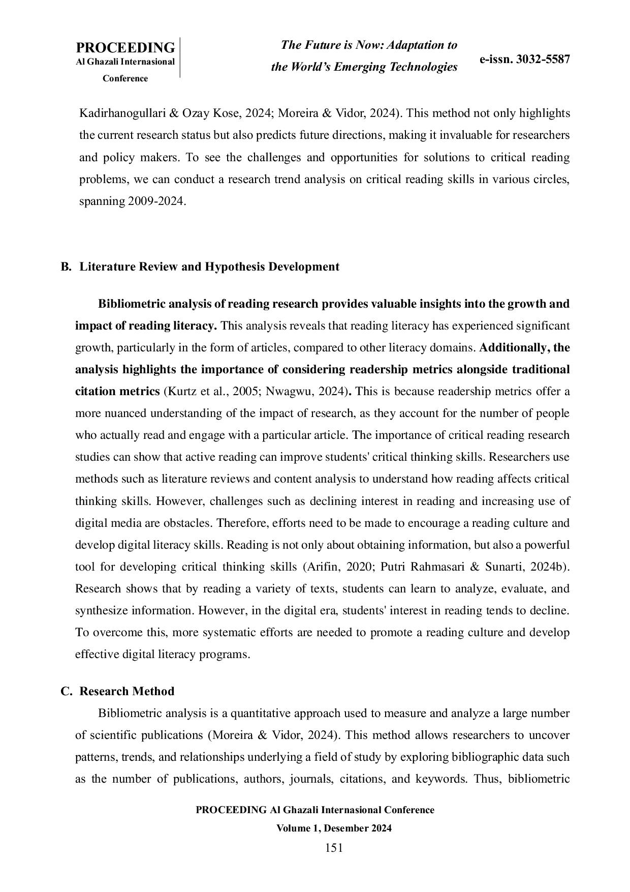 PROCEEDING AL GHAZALI International ConferencePROCEEDING AL GHAZALI International ConferenceAnalisis bibliometrik merupakan sebuah pendekatan kuantitatif yang digunakan untuk mengukur dan menganalisis sejumlah besar publikasi ilmiah. Di tengah banjir informasi yang kita hadapi setiap hari, kemampuan untuk memilah dan mengevaluasi informasi secara kritis menjadi semakin penting. Fokus yang berlebihan pada pengujian seringkali mengorbankan pengembangan keterampilan berpikir tingkat tinggi yang lebih kompleks. Untuk mengatasi hal ini, diperlukan perubahan paradigma dalam pendidikan, di mana pengembangan keterampilan membaca kritis menjadi prioritas utama. Penelitian semakin menekankan pentingnya konteks dalam mengembangkan kemampuan membaca kritis. Faktor-faktor seperti budaya, bahasa, dan latar belakang sosial-ekonomi siswa dianggap sebagai faktor yang mempengaruhi kemampuan mereka dalam membaca secara kritis. Hasil analisis melalui network visualization, overlay visualization dan density visualization menunjukkan banyak penelitian fokus pada bagaimana mengembangkan dan mengukur keterampilan membaca kritis pada siswa. Membaca kritis tidak hanya diterapkan dalam bidang literasi, tetapi juga dalam berbagai disiplin ilmu seperti sains, sosial, dan humaniora. Penelitian mengenai membaca kritis telah menunjukkan perkembangan yang signifikan dalam beberapa tahun terakhir. Tren yang muncul menunjukkan bahwa kemampuan membaca kritis bukan hanya keterampilan yang penting untuk keberhasilan akademik, tetapi juga merupakan keterampilan yang sangat relevan dalam kehidupan sehari-hari.