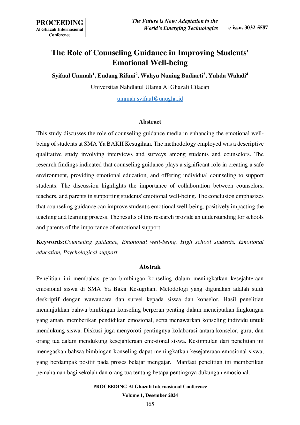 PROCEEDING AL GHAZALI International ConferencePROCEEDING AL GHAZALI International ConferencePenelitian ini membahas peran bimbingan konseling dalam meningkatkan kesejahteraan emosional siswa di SMA Ya Bakii Kesugihan. Metodologi yang digunakan adalah studi deskriptif dengan wawancara dan survei kepada siswa dan konselor. Hasil penelitian menunjukkan bahwa bimbingan konseling berperan penting dalam menciptakan lingkungan yang aman, memberikan pendidikan emosional, serta menawarkan konseling individu untuk mendukung siswa. Diskusi juga menyoroti pentingnya kolaborasi antara konselor, guru, dan orang tua dalam mendukung kesejahteraan emosional siswa. Kesimpulan dari penelitian ini menegaskan bahwa bimbingan konseling dapat meningkatkan kesejateraan emosional siswa, yang berdampak positif pada proses belajar mengajar. Manfaat penelitian ini memberikan pemahaman bagi sekolah dan orang tua tentang betapa pentingnya dukungan emosional.
