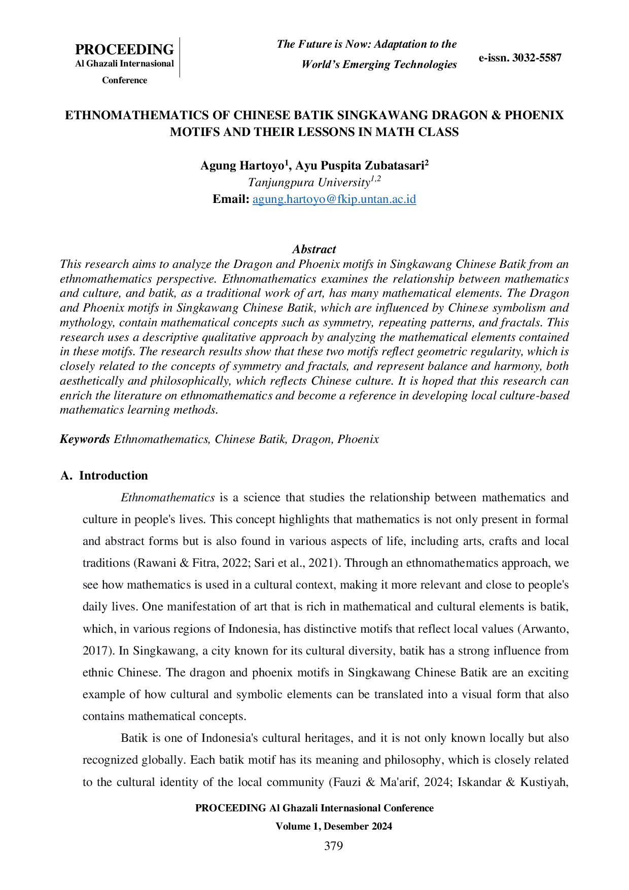 PROCEEDING AL GHAZALI International ConferencePROCEEDING AL GHAZALI International ConferencePenelitian ini bertujuan untuk menganalisis motif Naga dan Feniks pada Batik Tionghoa Singkawang dari perspektif etnomatematika. Etnomatematika mengkaji hubungan antara matematika dan budaya, dan batik, sebagai karya seni tradisional, memiliki banyak unsur matematika. Motif Naga dan Feniks pada Batik Tionghoa Singkawang, yang dipengaruhi oleh simbolisme dan mitologi Tionghoa, mengandung konsep matematika seperti simetri, pola berulang, dan fraktal. Penelitian ini menggunakan pendekatan kualitatif deskriptif dengan menganalisis unsur-unsur matematika yang terkandung dalam motif-motif tersebut. Hasil penelitian menunjukkan bahwa kedua motif ini mencerminkan keteraturan geometris, yang erat kaitannya dengan konsep simetri dan fraktal, serta merepresentasikan keseimbangan dan harmoni, baik secara estetika maupun filosofis, yang mencerminkan budaya Tionghoa. Diharapkan penelitian ini dapat memperkaya literatur tentang etnomatematika dan menjadi referensi dalam mengembangkan metode pembelajaran matematika berbasis budaya lokal.