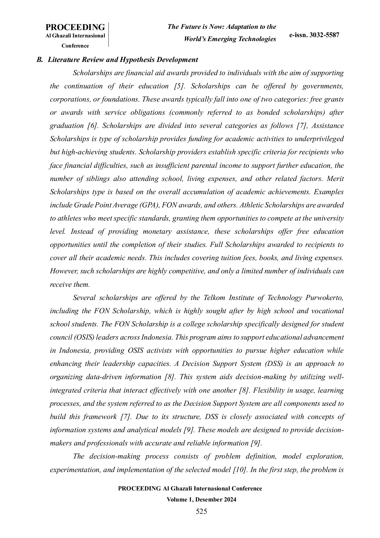 PROCEEDING AL GHAZALI International ConferencePROCEEDING AL GHAZALI International ConferencePenelitian ini bertujuan menerapkan metode TOPSIS sebagai alat efektif dalam sistem pengambilan keputusan untuk seleksi penerima beasiswa. Proses seleksi beasiswa merupakan langkah penting dalam memastikan lembaga memilih penerima berpotensi yang sesuai kriterianya. Peneliti mengidentifikasi kriteria terkait seleksi beasiswa, seperti nilai rata-rata kartu rapor siswa, posisi siswa di OSIS, pengalaman siswa, dan prestasi siswa. Data dari setiap pihak diubah menjadi skala relatif menggunakan teknik normalisasi. Metode TOPSIS kemudian diterapkan untuk memperoleh peringkat relatif setiap siswa. Metode ini memilih siswa dengan jarak terdekat pada solusi ideal positif (nilai tertinggi) dan jarak terjauh dari solusi ideal negatif (nilai terendah). Penelitian ini menggunakan studi kasus proses seleksi penerima beasiswa FON di Telkom Institute of Technology, Purwokerto. Hasil menunjukkan bahwa TOPSIS memberikan penilaian konsisten dan objektif bagi setiap siswa. Analisis sensitivitas dilakukan untuk menguji keandalan hasil seleksi dengan mengubah bobot kriteria. Hasil menunjukkan perubahan bobot kriteria memengaruhi peringkat, sehingga manajemen dapat mempertimbangkan preferensi berbeda dengan hasil preferensi tertinggi 0,844901. Penelitian ini memberikan kontribusi penting di bidang sistem pengambilan keputusan dan seleksi beasiswa.