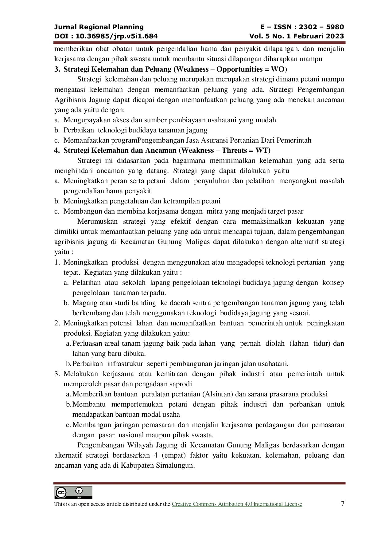 Jurnal Regional PlanningJurnal Regional PlanningKabupaten Simalungun merupakan sentra pertanaman jagung di Provinsi Sumatera Utara dimana salah satu Kecamatan yaitu Kecamatan Gunung Maligas yang merupakan tingkat produktivitasnya diatas rata rata produktivitas Jagung di Kabupaten Simalungun. Jagung mempunyai peran mendukung perekonomian nasional, mengingat fungsinya yang multiguna. Jagung dapat dimanfaatkan untuk pangan, pakan, dan bahan baku industri. Tujuan dari penelitian adalah : untuk menganalisis Strategi Pengembangan Jagung di Kecamatan Gunung Maligas jagung ditinjau dari keadaan finansial di daerah penelitian, menjelaskan informasi strategi pengembangan budidaya jagung, menjelaskan kebijakan yang dilaksanakan guna mendorong pengembangan usaha budidaya jagung. Daerah penelitian ditentukan secara sengaja dengan pertimbangan jumlah produksi. Metode analisis untuk menjelaskan strategi pengembangan usahatani jagung digunakan analisis SWOT. Hasil penelitian menyimpulkan bahwa : usahatani jagung didaerah penelitian layak untuk diusahakan; strategi usahatani jagung yang perlu dilaksanakan petani adalah strategi, Meningkatkan produksi dengan menggunakan atau mengadopsi tehnologi pertanian yang tepat, meningkatkan potensi lahan dan memanfaatkan bantuan pemerintah untuk peningkatan produksi, melakukan kerjasama dengan pihak industri atau pemerintah, melakukan kerjasama atau kemitraan dengan pihak industri atau pemerintah untuk memperoleh pasar dan pengadaan saprodi.