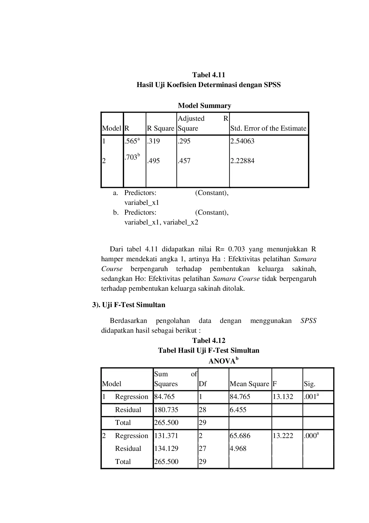 Maqasid: Jurnal Studi Hukum IslamMaqasid: Jurnal Studi Hukum IslamPenelitian ini menggunakan mixed methods research dengan perpaduan pendekatan kualitatif dan kuantitatif dengan menggunakan metode observasi, angket, wawancara, dan dokumentasi untuk mendapatkan data yang berhubungan dengan Pelatihan Samara Course dan uji statistik menggunakan SPSS dengan analisis regresi berganda dengan jumlah peserta 150 orang. Adapun sampelnya 30 orang diambil secara simple random sampling. Dari analisis tentang konsep sakinah pengertian Samara Course merupakan proses pemahaman hubungan pasangan dalam membentuk kedekatan untuk mewujudkan komitmen bersama menjalani rumahtangga sakinah, implementasi Samara Course diwujudkan dalam sikap dan tindakan baik bagi peserta yang belum menikah maupun sudah. Dari analisis, didapat persamaan nilai regresi berganda Ŷ = 5.866 0.107 X1 0.748 X2, yang menunjukan bahwa variabel ketepatan penggunaan unsur‑unsur pelatihan (X1) dan tercapainya tujuan pelatihan (X2) berpengaruh terhadap terbentuknya keluarga sakinah. Sedangkan nilai koefisien determinasi sebesar 0,457 yang menunjukan bahwa 45,7% terjadi pembentukan keluarga sakinah yang dipengaruhi oleh variabel X1 dan variabel X2. Uji f‑test memperoleh nilai signifikan sebesar 0.000 dimana angka tersebut <0.05 yang menunjukkan bahwa terdapat pengaruh yang signifikan antara pengaruh efektivitas pelatihan Samara course terhadap pembentukkan keluarga sakinah. Sedangkan uji t‑test parsial diperoleh nilai 1,959 yang menunjukan terdapat pengaruh yang signifikan antara variabel X1 dan variabel X2 terhadap variabel terbentuknya keluarga sakinah.
