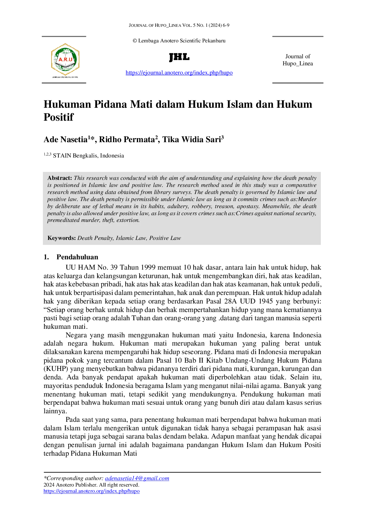 Journal of Hupo_LineaJournal of Hupo_LineaPenelitian ini dilakukan dengan tujuan memahami dan menjelaskan bagaimana hukuman mati diposisikan dalam hukum Islam dan hukum positif. Metode penelitian yang digunakan adalah metode penelitian komparatif dengan data yang diperoleh dari survei kepustakaan. Hukuman mati diatur baik oleh hukum Islam maupun hukum positif. Hukuman mati diperbolehkan dalam hukum Islam untuk kejahatan seperti pembunuhan dengan penggunaan cara mematikan secara sengaja, zina, perampokan, pengkhianatan, dan murtad. Sementara itu, hukuman mati juga diizinkan dalam hukum positif untuk kejahatan seperti kejahatan terhadap keamanan negara, pembunuhan berencana, pencurian, dan pemerasan.
