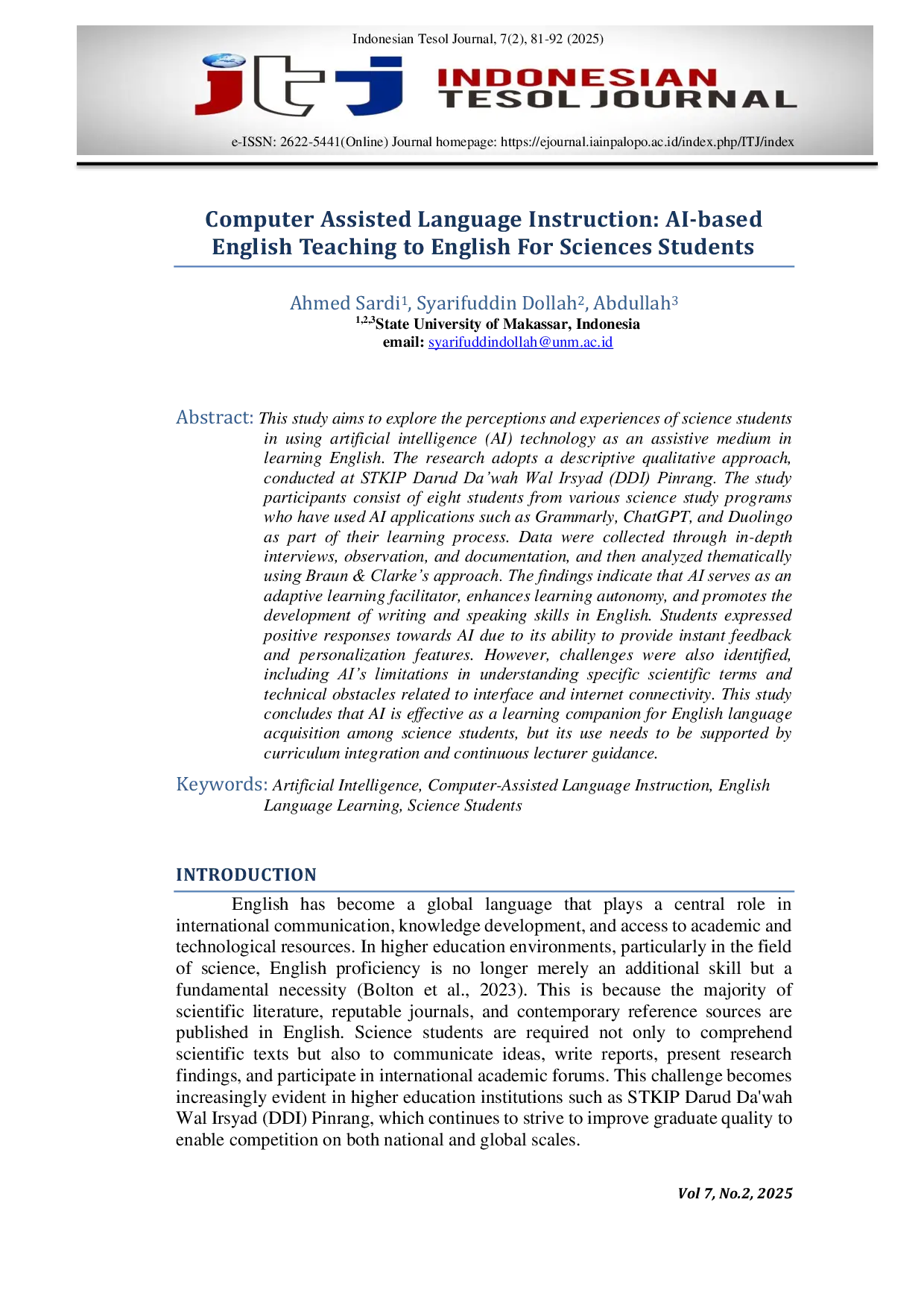 Indonesian TESOL JournalIndonesian TESOL JournalThis study aims to explore the perceptions and experiences of science students in using artificial intelligence (AI) technology as an assistive medium in learning English. The research adopts a descriptive qualitative approach, conducted at STKIP Darud Dawah Wal Irsyad (DDI) Pinrang. The study participants consist of eight students from various science study programs who have used AI applications such as Grammarly, ChatGPT, and Duolingo as part of their learning process. Data were collected through in-depth interviews, observation, and documentation, and then analyzed thematically using Braun & Clarkes approach. The findings indicate that AI serves as an adaptive learning facilitator, enhances learning autonomy, and promotes the development of writing and speaking skills in English. Students expressed positive responses towards AI due to its ability to provide instant feedback and personalization features. However, challenges were also identified, including AIs limitations in understanding specific scientific terms and technical obstacles related to interface and internet connectivity. This study concludes that AI is effective as a learning companion for English language acquisition among science students, but its use needs to be supported by curriculum integration and continuous lecturer guidance.