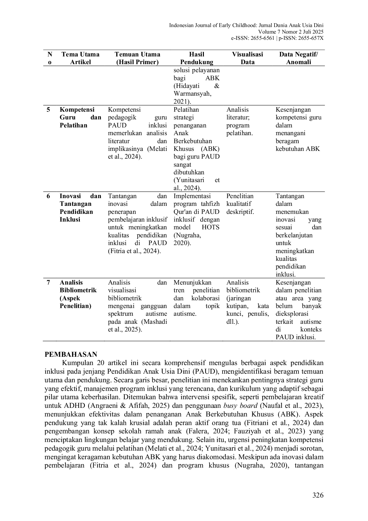 Pendidikan inklusif di PAUD kompleks dan multifaspekt, memerlukan strategi guru, manajemen, dan kurikulum adaptif untuk mengakomodasi ABK.Peran orang tua dan lingkungan sekolah ramah anak sangat penting.Tantangan utama termasuk kesenjangan kompetensi guru dan sumber daya, sehingga diperlukan penelitian lanjutan untuk solusi praktis.