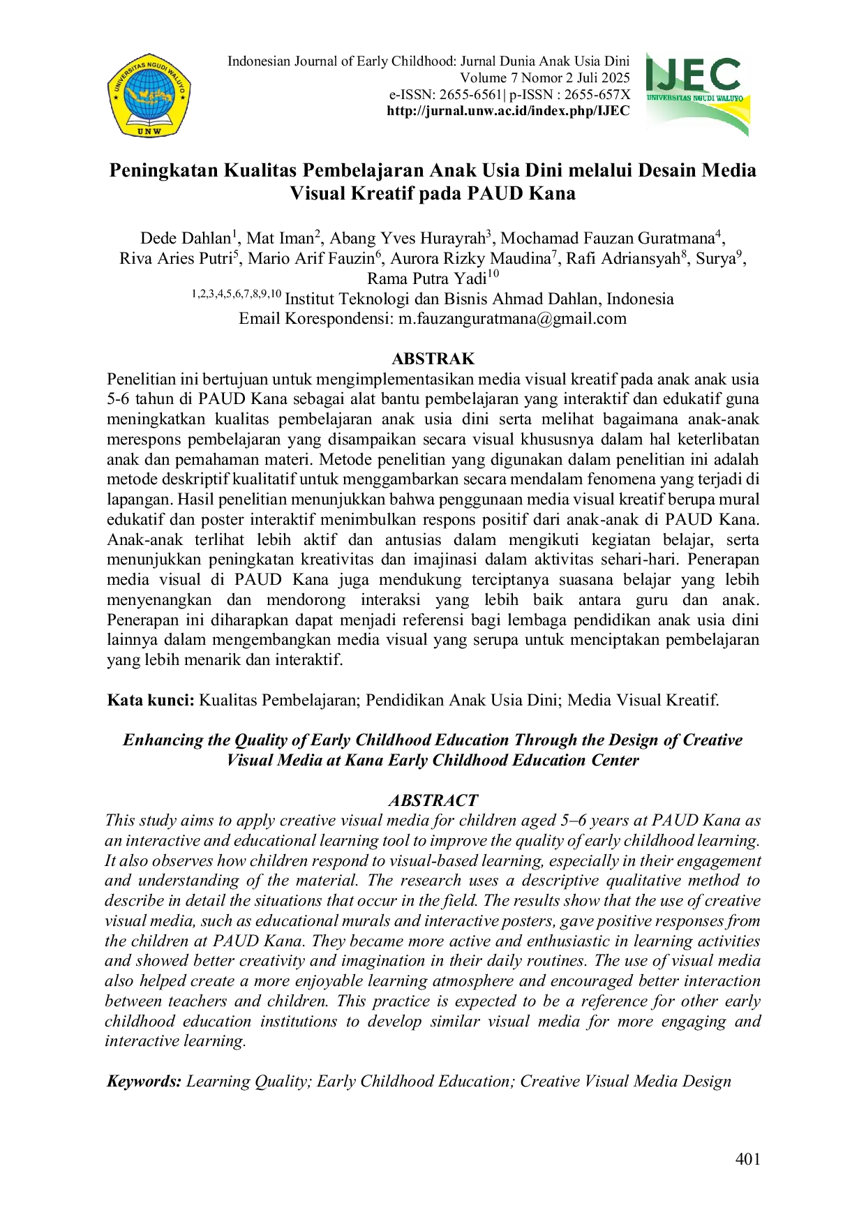 Indonesian Journal of Early Childhood: Jurnal Dunia Anak Usia DiniIndonesian Journal of Early Childhood: Jurnal Dunia Anak Usia DiniPenelitian ini bertujuan untuk mengimplementasikan media visual kreatif pada anak-anak usia 5-6 tahun di PAUD Kana sebagai alat bantu pembelajaran yang interaktif dan edukatif guna meningkatkan kualitas pembelajaran anak usia dini serta melihat bagaimana anak-anak merespons pembelajaran yang disampaikan secara visual khususnya dalam hal keterlibatan anak dan pemahaman materi. Metode penelitian yang digunakan dalam penelitian ini adalah metode deskriptif kualitatif untuk menggambarkan secara mendalam fenomena yang terjadi di lapangan. Hasil penelitian menunjukkan bahwa penggunaan media visual kreatif berupa mural edukatif dan poster interaktif menimbulkan respons positif dari anak-anak di PAUD Kana. Anak-anak terlihat lebih aktif dan antusias dalam mengikuti kegiatan belajar, serta menunjukkan peningkatan kreativitas dan imajinasi dalam aktivitas sehari-hari. Penerapan media visual di PAUD Kana juga mendukung terciptanya suasana belajar yang lebih menyenangkan dan mendorong interaksi yang lebih baik antara guru dan anak. Penerapan ini diharapkan dapat menjadi referensi bagi lembaga pendidikan anak usia dini lainnya dalam mengembangkan media visual yang serupa untuk menciptakan pembelajaran yang lebih menarik dan interaktif.