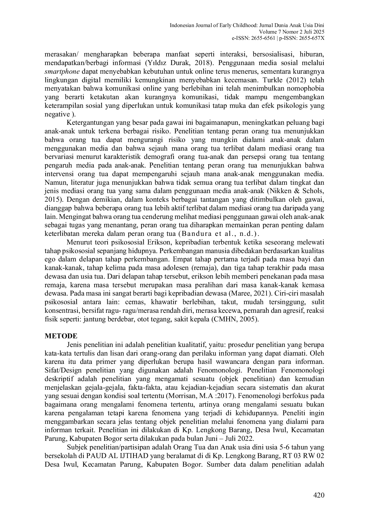 Indonesian Journal of Early Childhood: Jurnal Dunia Anak Usia DiniIndonesian Journal of Early Childhood: Jurnal Dunia Anak Usia DiniPenelitian ini bertujuan untuk mendeskripsikan peran yang dilakukan orang tua dalam mendampingi anak dalam menghadapi penggunaan gawai pada Anak Usia Dini yang berdampak pada Psikososial. Penelitian ini menggunakan metode kualitatif, pendekatan naratif inquiri berbasis studi kasus pada Lembaga Pendidikan Anak Usia Dini (PAUD) di Parung Bogor. Sedangkan partisipan dalam penelitian ini mencakup orang tua dan peserta didik di PAUD Parung Bogor. Data diperoleh dengan melalui observasi, teknik wawancara, dan studi dokumentasi. Penelitian ini menghasilkan kesimpulan bahwa Penggunaan Gawai pada Anak usia dini di PAUD Parung Bogor intensitasnya tergolong cukup tinggi, yaitu di atas satu jam penggunaan, aplikasi yang dibuka anak selama menggunakan gawai adalah Youtube dan Game. Selain itu, penelitian ini juga menghasilkan temuan bahwa beberapa anak mengalami gangguan psikososial.