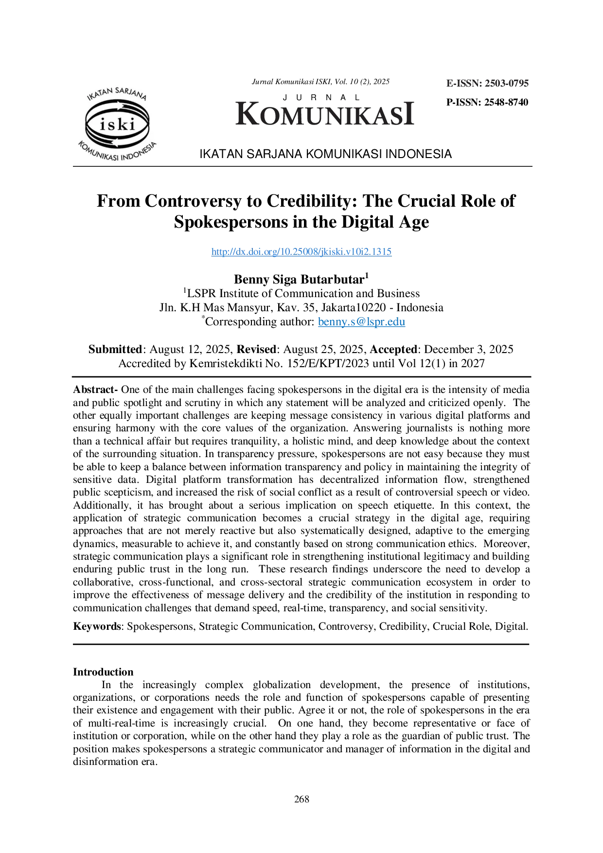- From Controversy to Credibility: The Crucial Role of Spokespersons in the Digital Age | Jurnal Komunikasi... doi.org/10.25008/jkiski.v10i2.1315From Controversy to Credibility The Crucial Role of Spokespersons in the Digital Age Jurnal Komunikasi doi 10 25008 jkiski v10i2 1315