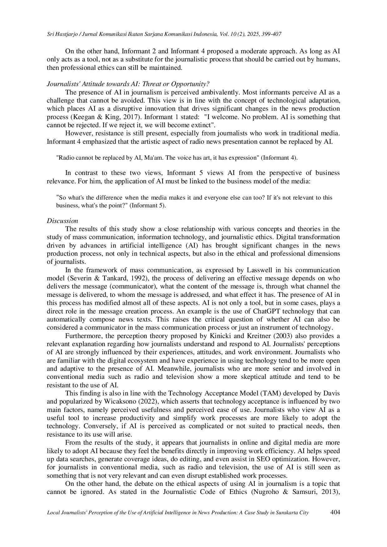 Jurnal Komunikasi Ikatan Sarjana Komunikasi IndonesiaJurnal Komunikasi Ikatan Sarjana Komunikasi IndonesiaPengembangan teknologi kecerdasan buatan (AI) telah berdampak signifikan terhadap praktik jurnalisme, termasuk pada tingkat lokal. Penelitian ini mengungkap pandangan wartawan di Kota Surakarta mengenai manfaat, tantangan, dan implikasi etika penggunaan AI dalam produksi berita melalui pendekatan studi kasus kualitatif dengan wawancara mendalam pada lima wartawan dari berbagai platform media. Hasil menunjukkan bahwa AI dianggap sebagai alat pendukung yang mempercepat proses kerja dan meningkatkan efisiensi produksi. Namun, kekhawatiran terhadap penurunan kualitas informasi dan potensi pelanggaran etika jurnalistik tetap menjadi isu kritis. Penerimaan AI dipengaruhi oleh manfaat yang dirasakan, kemudahan penggunaan, dan nilai profesionalisme yang dijunjung wartawan. Penelitian ini merekomendasikan penguatan literasi digital serta pembaruan regulasi etika jurnalistik untuk mengatasi tantangan transformasi media di era AI.