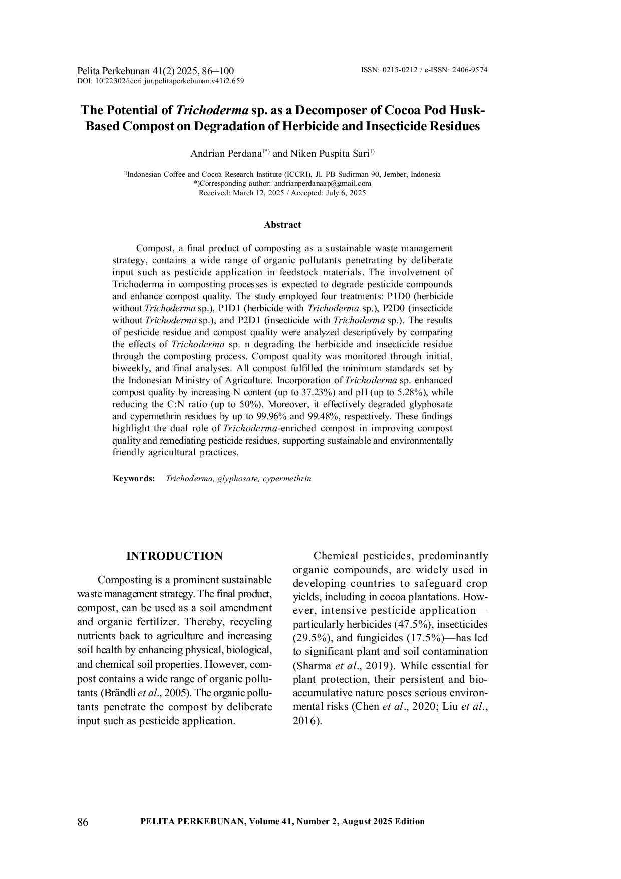 Pelita PerkebunanPelita PerkebunanKompos, sebagai produk akhir proses pengomposan yang merupakan strategi pengelolaan limbah berkelanjutan, mengandung beragam polutan organik yang masuk secara sengaja melalui aplikasi pestisida pada bahan baku. Keterlibatan Trichoderma dalam proses pengomposan diharapkan dapat menguraikan senyawa pestisida serta meningkatkan kualitas kompos. Penelitian ini menggunakan empat perlakuan: P1D0 (herbisida tanpa Trichoderma sp.), P1D1 (herbisida dengan Trichoderma sp.), P2D0 (insektisida tanpa Trichoderma sp.), dan P2D1 (insektisida dengan Trichoderma sp.). Hasil residu pestisida dan kualitas kompos dianalisis secara deskriptif dengan membandingkan pengaruh Trichoderma sp. dalam menguraikan residu herbisida dan insektisida selama proses pengomposan. Kualitas kompos dipantau melalui analisis awal, dua mingguan, dan akhir. Semua kompos memenuhi standar minimum yang ditetapkan oleh Kementerian Pertanian Indonesia. Penambahan Trichoderma sp. meningkatkan kualitas kompos dengan meningkatkan kandungan N (hingga 37,23 %) dan pH (hingga 5,28 %), serta menurunkan rasio C:N (hingga 50 %). Selain itu, Trichoderma sp. secara efektif menguraikan residu glifosat dan sikpermethrin hingga masing‑masing 99,96 % dan 99,48 %. Temuan ini menegaskan peran ganda kompos yang diperkaya Trichoderma dalam memperbaiki kualitas kompos serta meremediasi residu pestisida, mendukung praktik pertanian berkelanjutan dan ramah lingkungan.
