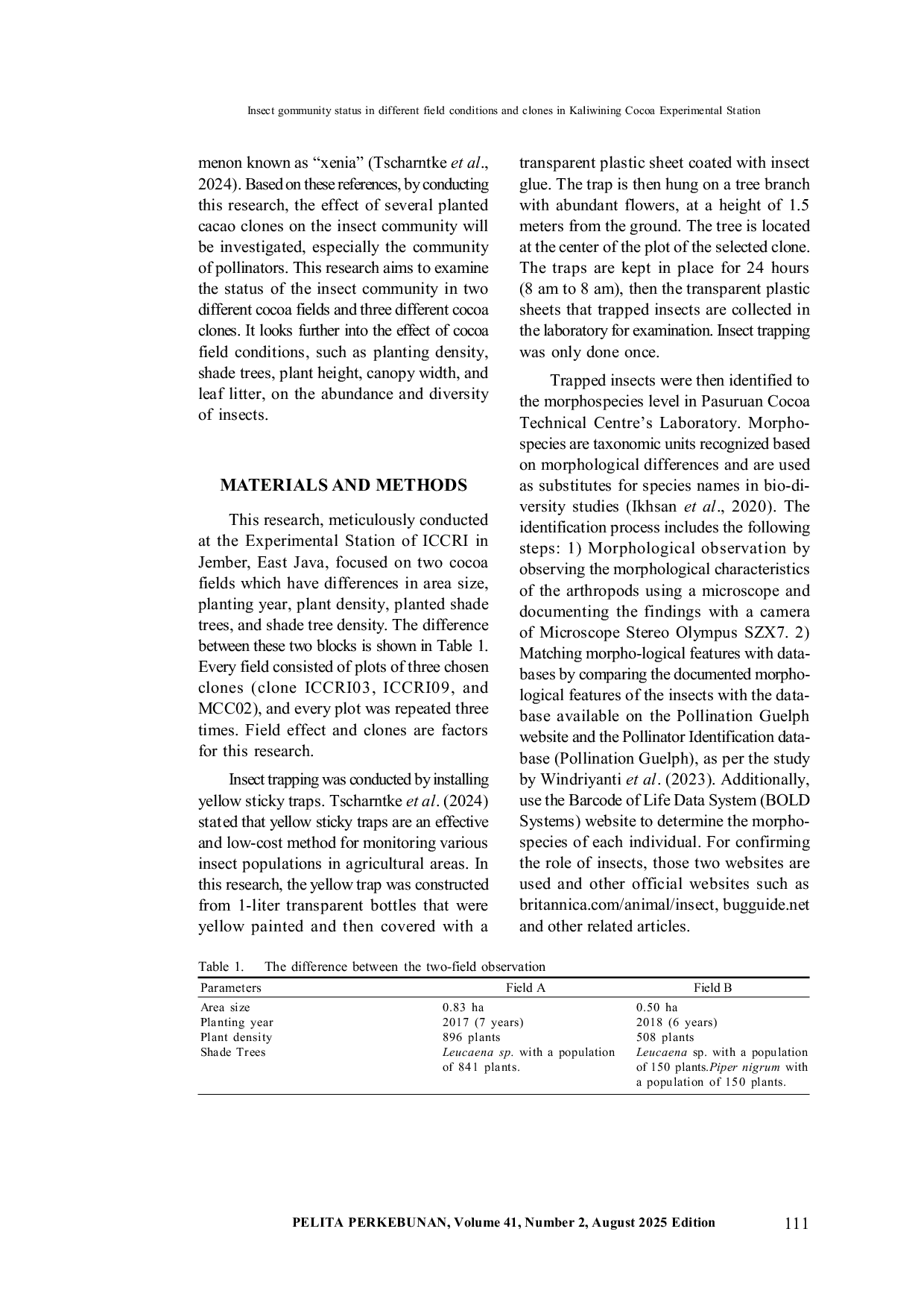 Pelita PerkebunanPelita PerkebunanKomunitas serangga sangat penting bagi keberhasilan ekologi dan ekonomi sistem agroforestri kakao, karena menyediakan fungsi esensial seperti penyerbukan, pengendalian hama, dan siklus nutrisi. Keberadaan dan kinerjanya dipengaruhi oleh struktur lahan, genetika klon, kompleksitas habitat, dan praktik pertanian. Penelitian ini dilakukan di Stasiun Eksperimental Lembaga Penelitian Kopi dan Kakao Indonesia (ICCRI) di Jember, Jawa Timur, dengan memfokuskan pada dua tipe bidang kakao yang berbeda (perbedaan tahun penanaman, kepadatan tanaman, dan pohon peneduh) serta tiga klon (ICCRI03, ICCRI09, dan MCC02). Hasil penelitian menyoroti peran kondisi lapangan dan faktor genetik dalam membentuk keragaman dan kelimpahan serangga. Metode penangkap menggunakan perangkap kuning, sementara variabel lapangan yang diukur meliputi tinggi tanaman, lebar kanopi, dan jumlah daun rontok. Observasi mengidentifikasi 35 morfospecies serangga dari 30 famili serta delapan morfospecies non‑serangga, yang menekankan keragaman fungsional komunitas tersebut. Kondisi lapangan dan klon tidak menunjukkan pengaruh signifikan terhadap kelimpahan dan keragaman serangga. Variabel seperti tinggi tanaman, lebar kanopi, dan jumlah daun rontok tidak menunjukkan korelasi kuat dengan kelimpahan serangga. Lahan dengan lebih banyak pohon peneduh dan vegetasi menunjukkan kelimpahan serangga yang lebih tinggi, khususnya predator dan pengurai. Klon MCC02 mendukung populasi penyerbuk, ICCRI03 meningkatkan predator dan parasitoid, serta ICCRI09 meningkatkan keragaman secara keseluruhan. Namun, penyerbuk dan omnivora menunjukkan variasi yang minim di semua kondisi. Indeks keanekaragaman Shannon (H = 1,59‑1,75) mengindikasikan keanekaragaman sedang dengan distribusi spesies yang tidak merata. Penelitian ini menegaskan pentingnya menjaga kompleksitas habitat, mengoptimalkan manajemen lahan, dan seleksi klon secara strategis untuk meningkatkan layanan ekosistem seperti penyerbukan dan pengendalian hama sekaligus mendukung keanekaragaman hayati.