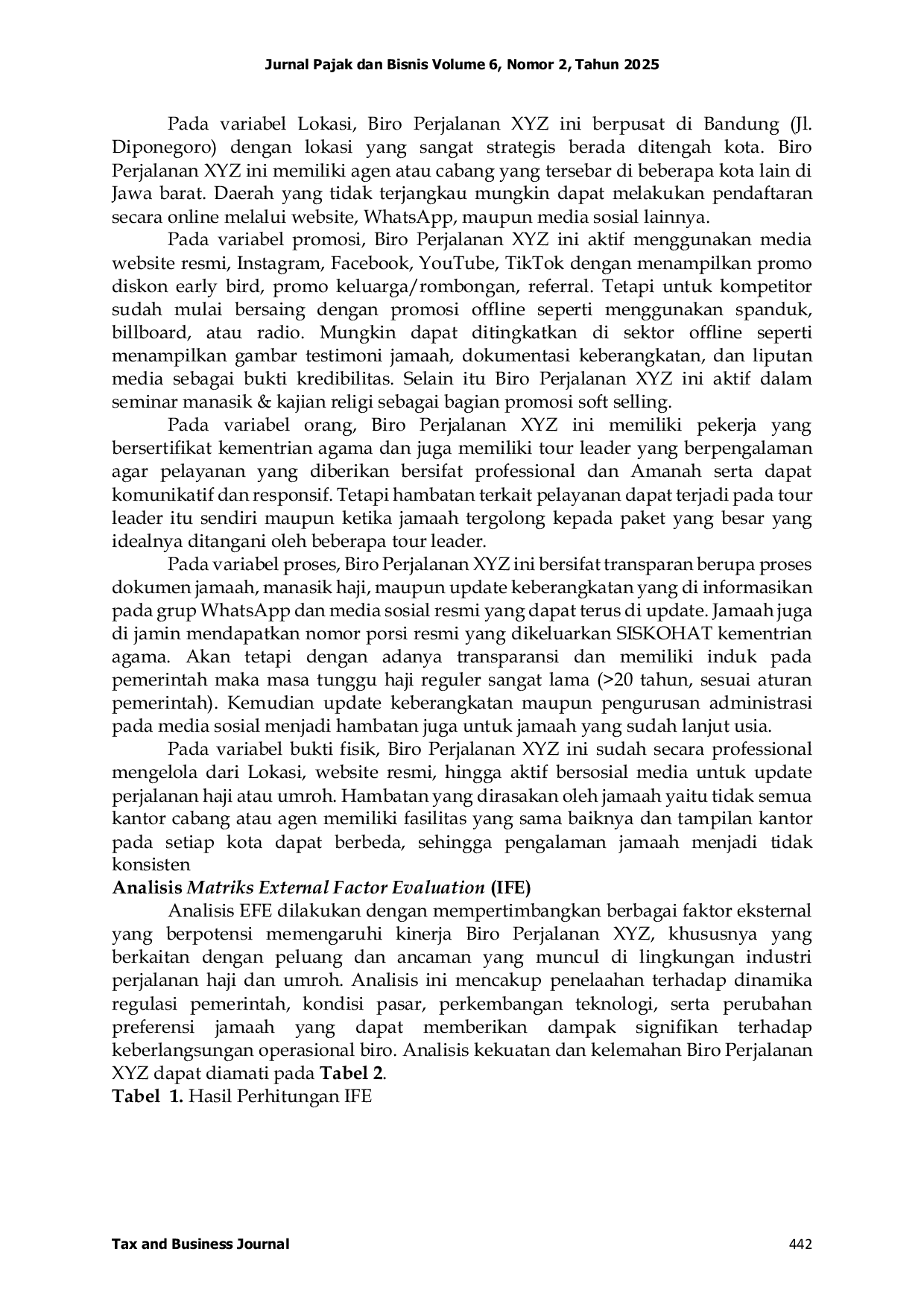Journal of Tax and BusinessJournal of Tax and BusinessBauran pemasaran 7P menjadi salah satu instrumen penting dalam meningkatkan daya saing Biro Perjalanan XYZ. Penelitian ini mengkaji penerapan bauran pemasaran 7P pada Biro Perjalanan XYZ dengan menggunakan analisis SWOT. Latar belakang penelitian berfokus pada meningkatnya permintaan ibadah haji dan umroh di Indonesia yang diikuti dengan persaingan ketat antar biro perjalanan. Metode penelitian menggunakan pendekatan kualitatif deskriptif melalui wawancara, observasi, serta data sekunder dari dokumen internal dan publikasi ilmiah. Hasil penelitian menunjukkan bahwa Biro Perjalanan XYZ memiliki sejumlah kekuatan, seperti legalitas resmi PPIU, variasi paket ibadah, fasilitas lengkap, promosi digital aktif, serta tenaga pendamping berpengalaman. Namun, terdapat kelemahan pada keterbatasan izin PIHK, harga paket premium yang relatif tinggi, dan perbedaan kualitas pelayanan di cabang tertentu. Dari sisi eksternal, peluang utama muncul dari tren peningkatan jamaah, dukungan regulasi pemerintah, serta perkembangan media digital, sementara ancaman berasal dari persaingan ketat, fluktuasi kurs, dan keterbatasan infrastruktur. Analisis SWOT menghasilkan skor sebesar 3,47, yang menunjukkan bahwa Biro Perjalanan XYZ cukup kuat dalam memanfaatkan peluang serta menghadapi ancaman pasar.