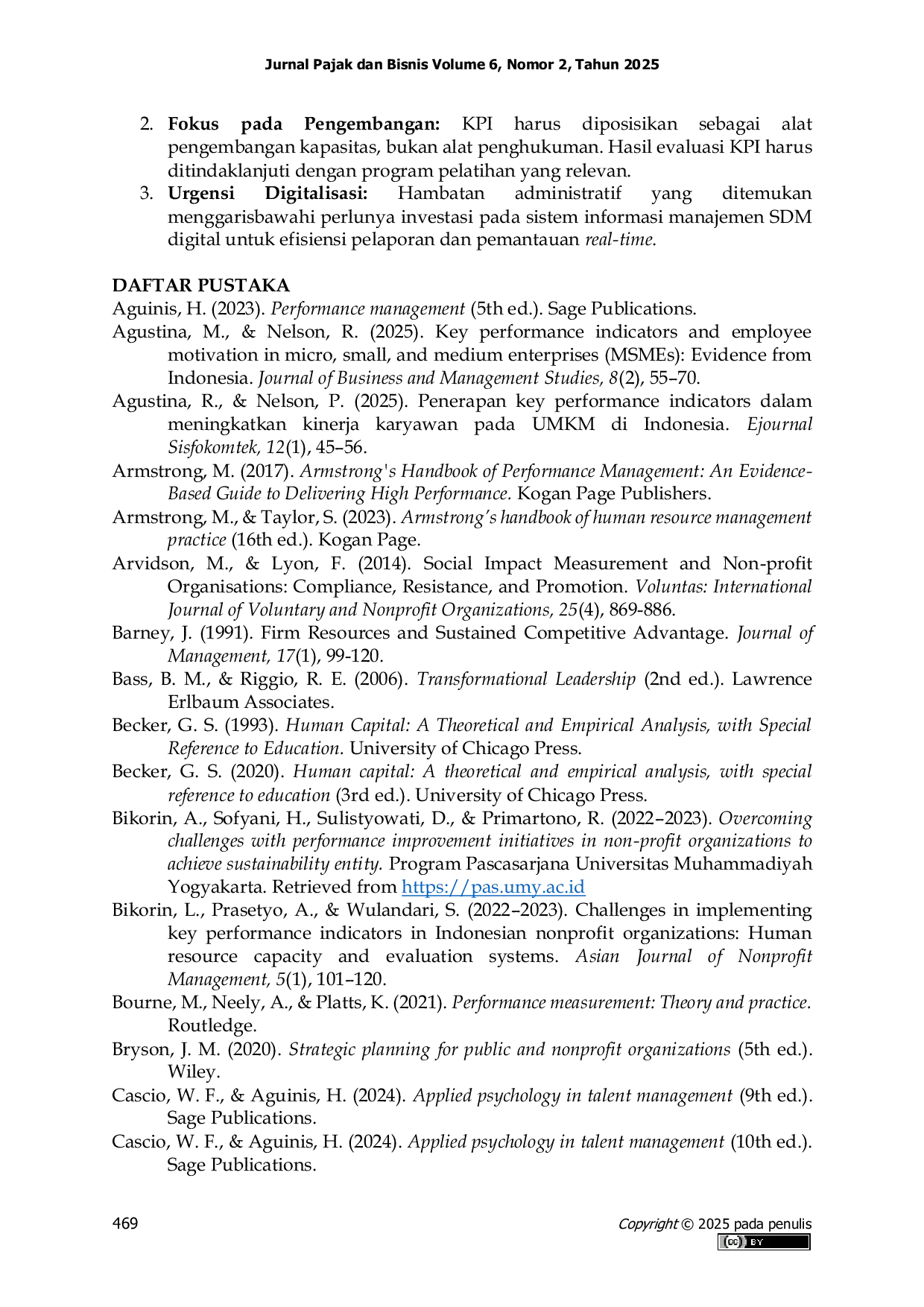 Journal of Tax and BusinessJournal of Tax and BusinessPenelitian ini bertujuan untuk menganalisis pengaruh penerapan Key Performance Indicators (KPI) terhadap peningkatan kompetensi dan kinerja Sumber Daya Manusia (SDM) pada lembaga nirlaba di kawasan Bintaro Jaya, Tangerang Selatan. Penelitian ini menggunakan metode campuran (Mixed Method) dengan desain sequential explanatory, yang melibatkan survei kuantitatif terhadap 100 responden dan wawancara mendalam dengan 15 informan terpilih. Pendekatan ini digunakan untuk mengevaluasi peran KPI sebagai instrumen strategis dalam menjamin efektivitas, akuntabilitas, dan keberlanjutan misi organisasi di tengah tantangan pengelolaan sektor nirlaba. Hasil penelitian menunjukkan bahwa KPI berpengaruh positif dan signifikan terhadap kinerja SDM, dibuktikan dengan uji t sebesar 14,269 dan nilai signifikansi 0,000 (< 0,05). Analisis regresi mengonfirmasi kelayakan model dengan nilai F hitung sebesar 203,112 serta reliabilitas instrumen yang sangat tinggi (Cronbachs Alpha 0,935). Temuan kualitatif memperkuat hasil statistik ini, di mana KPI terbukti efektif dalam mengarahkan perilaku kerja, memfasilitasi pembelajaran berkelanjutan, kompetensi manajerial, meskipun implementasinya masih menghadapi kendala administratif dan keterbatasan sumber daya. Penelitian ini menyimpulkan bahwa penerapan KPI secara konsisten memberikan kontribusi yang signifikan terhadap peningkatan kinerja SDM di sektor nirlaba. Berdasarkan temuan tersebut, penelitian ini merekomendasikan perlunya penguatan digitalisasi dalam sistem pelaporan kinerja dan strategi pengembangan SDM berbasis teknologi guna mengatasi hambatan operasional serta menjamin efektivitas manajemen yang berkelanjutan.