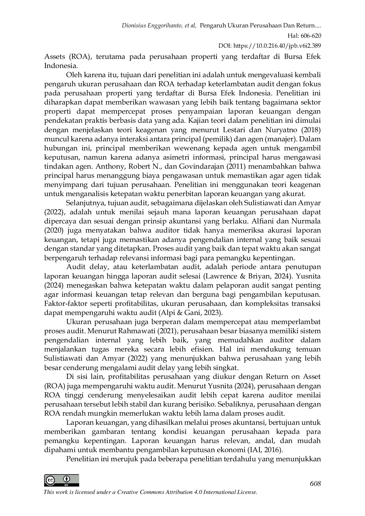 Penelitian ini menunjukkan bahwa ukuran perusahaan memiliki pengaruh negatif dan signifikan terhadap audit delay, yang berarti semakin besar ukuran perusahaan, semakin cepat proses audit diselesaikan.Selain itu, Return on Assets (ROA) juga berpengaruh negatif dan signifikan terhadap audit delay, mengindikasikan bahwa semakin tinggi profitabilitas perusahaan, semakin cepat audit diselesaikan.Secara simultan, ukuran perusahaan dan ROA berpengaruh signifikan terhadap audit delay, menjelaskan 35,3% variasi audit delay, sementara sisanya dijelaskan oleh faktor lain.