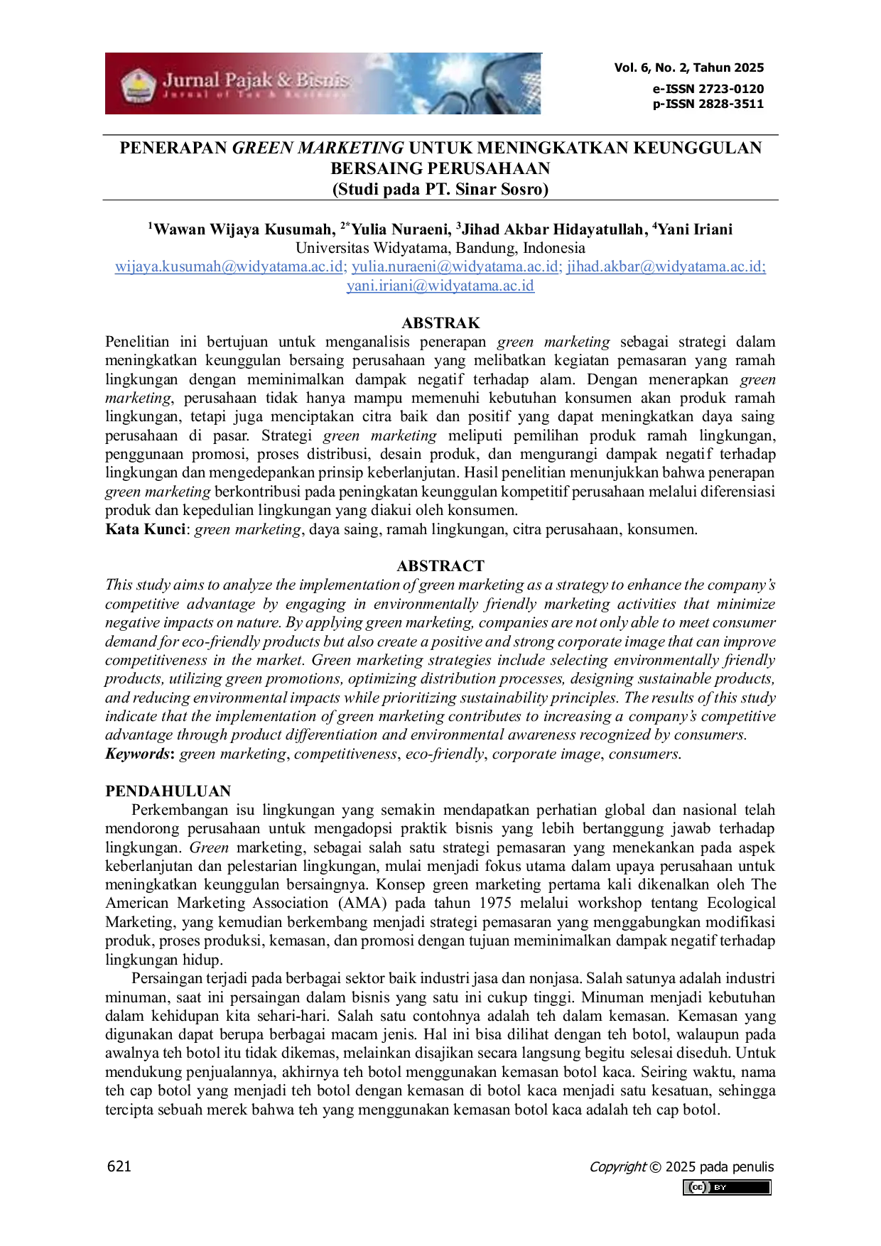 Journal of Tax and BusinessJournal of Tax and BusinessPenelitian ini bertujuan untuk menganalisis penerapan green marketing sebagai strategi dalam meningkatkan keunggulan bersaing perusahaan yang melibatkan kegiatan pemasaran yang ramah lingkungan dengan meminimalkan dampak negatif terhadap alam. Dengan menerapkan green marketing, perusahaan tidak hanya mampu memenuhi kebutuhan konsumen akan produk ramah lingkungan, tetapi juga menciptakan citra baik dan positif yang dapat meningkatkan daya saing perusahaan di pasar. Strategi green marketing meliputi pemilihan produk ramah lingkungan, penggunaan promosi, proses distribusi, desain produk, dan mengurangi dampak negatif terhadap lingkungan serta mengedepankan prinsip keberlanjutan. Hasil penelitian menunjukkan bahwa penerapan green marketing berkontribusi pada peningkatan keunggulan kompetitif perusahaan melalui diferensiasi produk dan kepedulian lingkungan yang diakui oleh konsumen.
