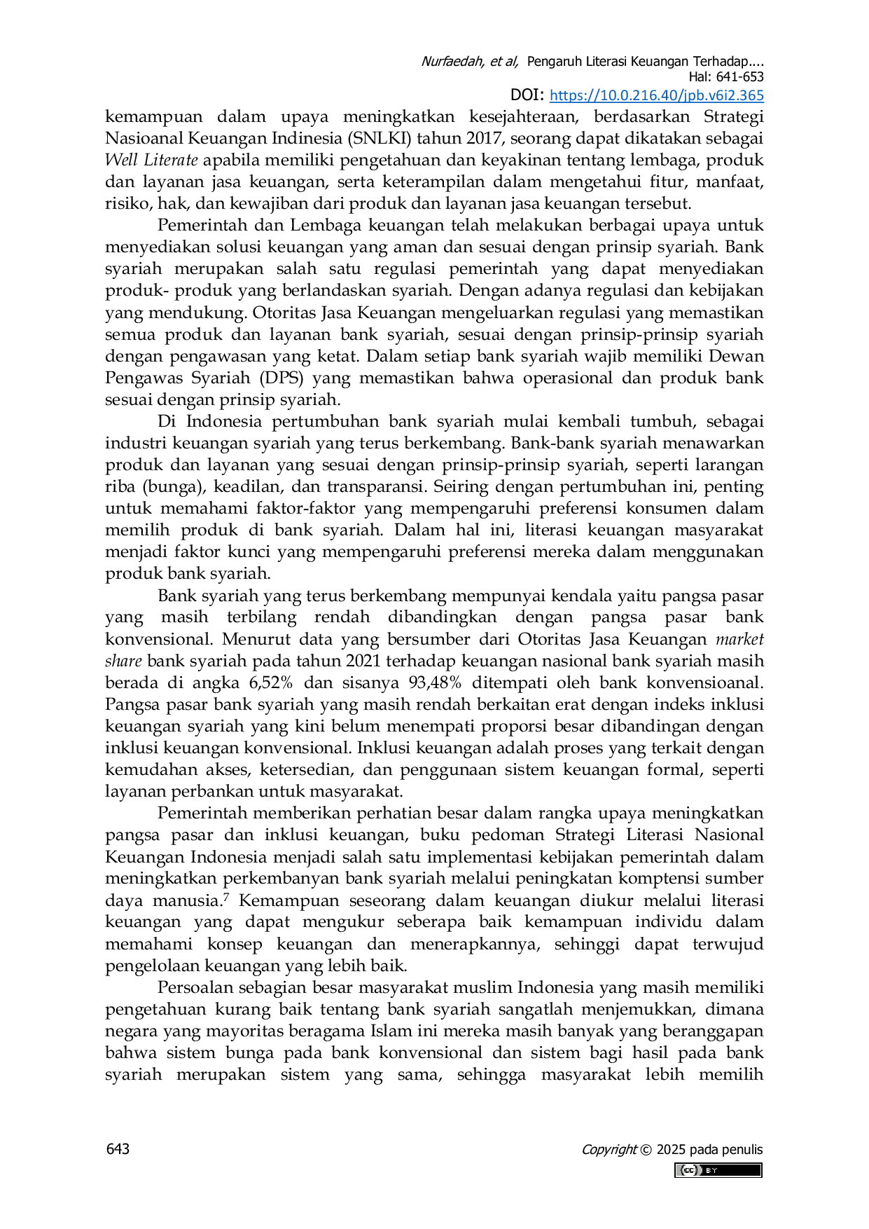 Journal of Tax and BusinessJournal of Tax and BusinessPenelitian ini bertujuan untuk mengetahui dan menganalisis di masyarakat Desa Dukuh. Literasi keuangan adalah pemahaman seseorang mengenai konsep dan produk keuangan yang memungkinkan seseorang dalam membuat keputusan keuangan. Preferensi terhadap produk bank syariah mencakup kecenderungan masyarakat unuk memilih produk yang ditawarkan oleh bank syariah. Keberadaan bank syariah telah lama dikenal di Indonesia, tingkat preferensi Masyarakat terhadap produk bank syariah masih relatif rendah dibandingkan dengan bank konvensional. Salah satu factor yang mempengaruhi rendahnya preferensi tersebut adalah literasi keuangan yang belum merata di Masyarakat. Jenis metode penelitian ini menggunakan metode pendekatan kuantitatif dengan teknik uji statistik melalui penyebaran angket. Populasi dalam penelitian ini berjumlah 910 jiwa dengan jumlah sampel 90 responden. Hasil penelitian menunjukan bahwa tingkat variabel literasi keuangan dan preferensi dalam menggunakan produk bank syariah cukup baik, serta variabel literasi keuangan berpengaruh positif dan siginifikan terhadap preferensi dalam menggunakan produk bank syariah. Temuan ini mengindikasikan bahwa pengguna bank syariah kerap kali merekomendasikan produk bank syariah kepada non pengguna produk bank syariah di masyarakat.