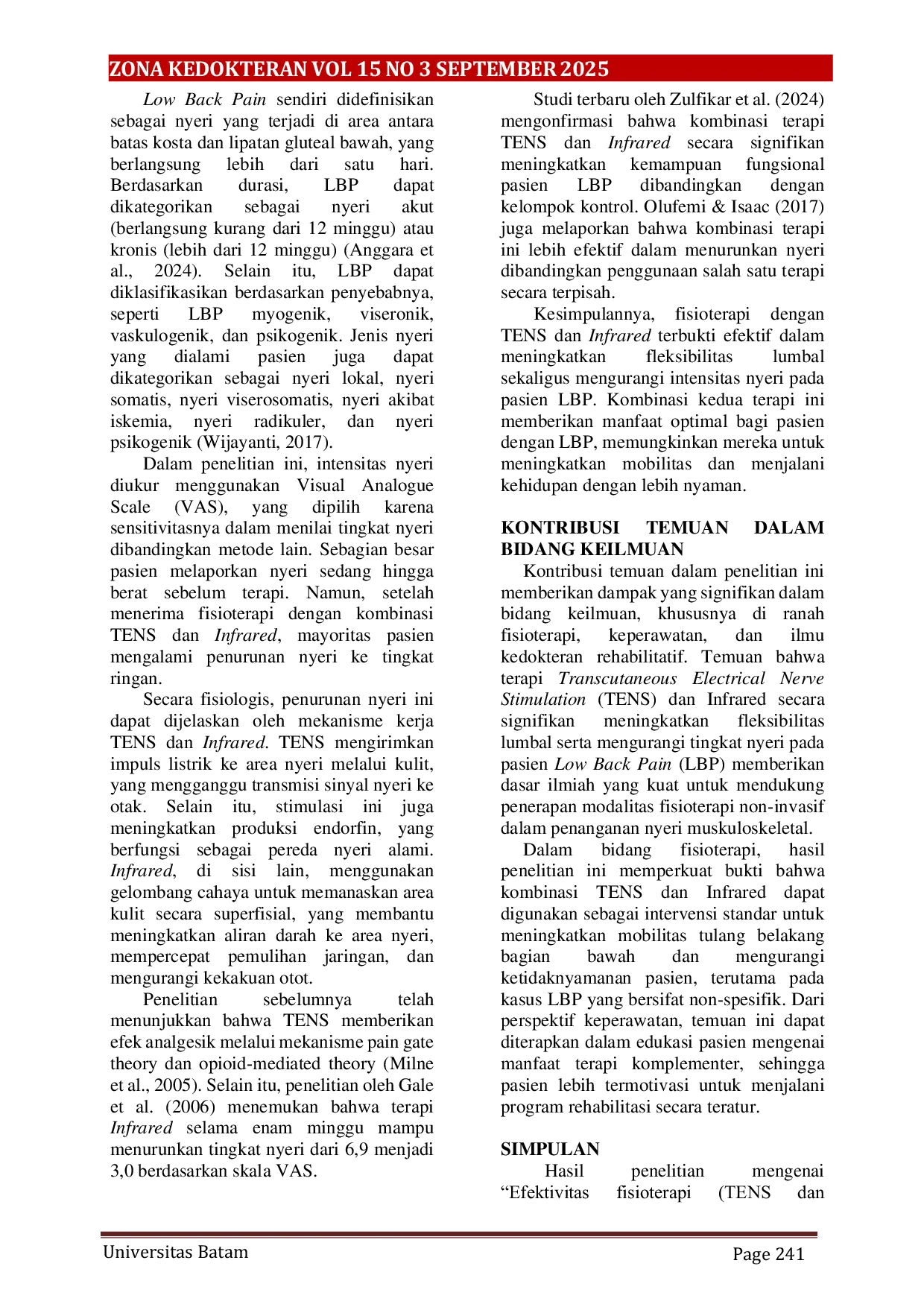 Zona Kedokteran: Program Studi Pendidikan Dokter Universitas BatamZona Kedokteran: Program Studi Pendidikan Dokter Universitas BatamLatar Belakang: Low Back Pain (LBP) tidak hanya mengganggu aktivitas sehari-hari, tetapi juga dapat berdampak negatif pada kualitas hidup dan produktivitas individu. Treatment fisioterapi telah terbukti menjadi salah satu metode non-farmakologis yang efektif dalam penanganan LBP. Fisioterapi berperan dalam peningkatan fleksibilitas lumbal dan mengurangi nyeri LBP. Berbagai teknik fisioterapi dapat diterapkan, termasuk TENS, dan Infrared. Metode: Penelitian ini menggunakan desain pre-eksperimental dengan pendekatan one group pre-post test. Teknik sampling yang digunakan adalah accidental sampling pada 31 pasien fisioterapi yang mengalami Low Back Pain di RSUD Kota Tanjungpinang. Data dikumpulkan dengan lembar observasi schober test dan VAS (visual analouge scale). Analisis data dilakukan dengan uji statistik paired t test. Hasil: Hasil penelitian menunjukkan bahwa setelah fisioterapi dilakukan, fleksibilitas lumbal terbatas menurun drastis menjadi 6,5%, sementara pasien dengan fleksibilitas normal meningkat menjadi 93,5%. Dan terjadi perbaikan signifikan pada tingkat nyeri, di mana 64,5% pasien nyeri ringan, 35,5% mengalami nyeri sedang, dan tidak ada lagi pasien yang mengalami nyeri berat atau sangat berat. Hasil uji paired sample t-test memperoleh nilai p-value sebesar 0,000. Kesimpulan: Pemberian fisioterapi (TENS dan Infrared) efektif pada penanganan kasus Low Back Pain yang ditinjau dari fleksibilitas lumbal di RSUD Kota Tanjung pinang.