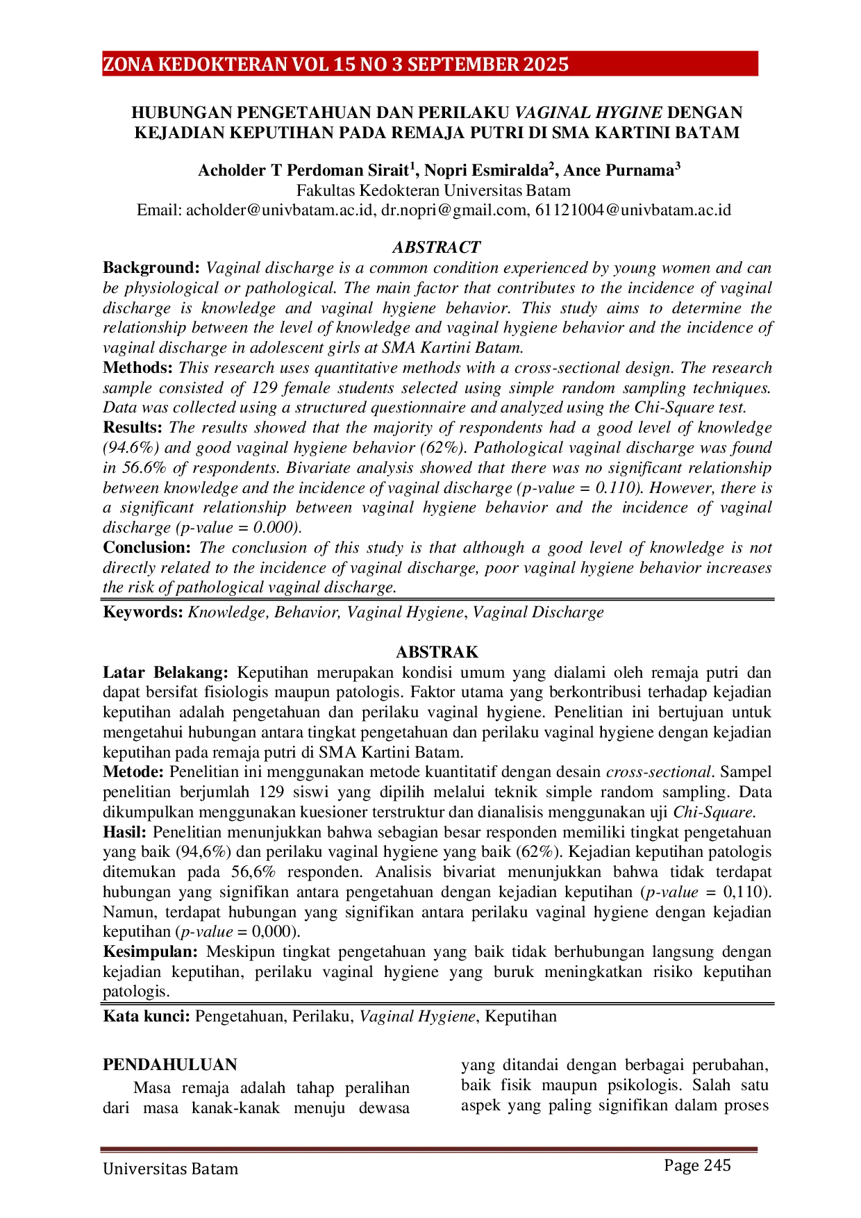 Zona Kedokteran: Program Studi Pendidikan Dokter Universitas BatamZona Kedokteran: Program Studi Pendidikan Dokter Universitas BatamLatar Belakang: Keputihan merupakan kondisi umum yang dialami oleh remaja putri dan dapat bersifat fisiologis maupun patologis. Faktor utama yang berkontribusi terhadap kejadian keputihan adalah pengetahuan dan perilaku vaginal hygiene. Penelitian ini bertujuan untuk mengetahui hubungan antara tingkat pengetahuan dan perilaku vaginal hygiene dengan kejadian keputihan pada remaja putri di SMA Kartini Batam.