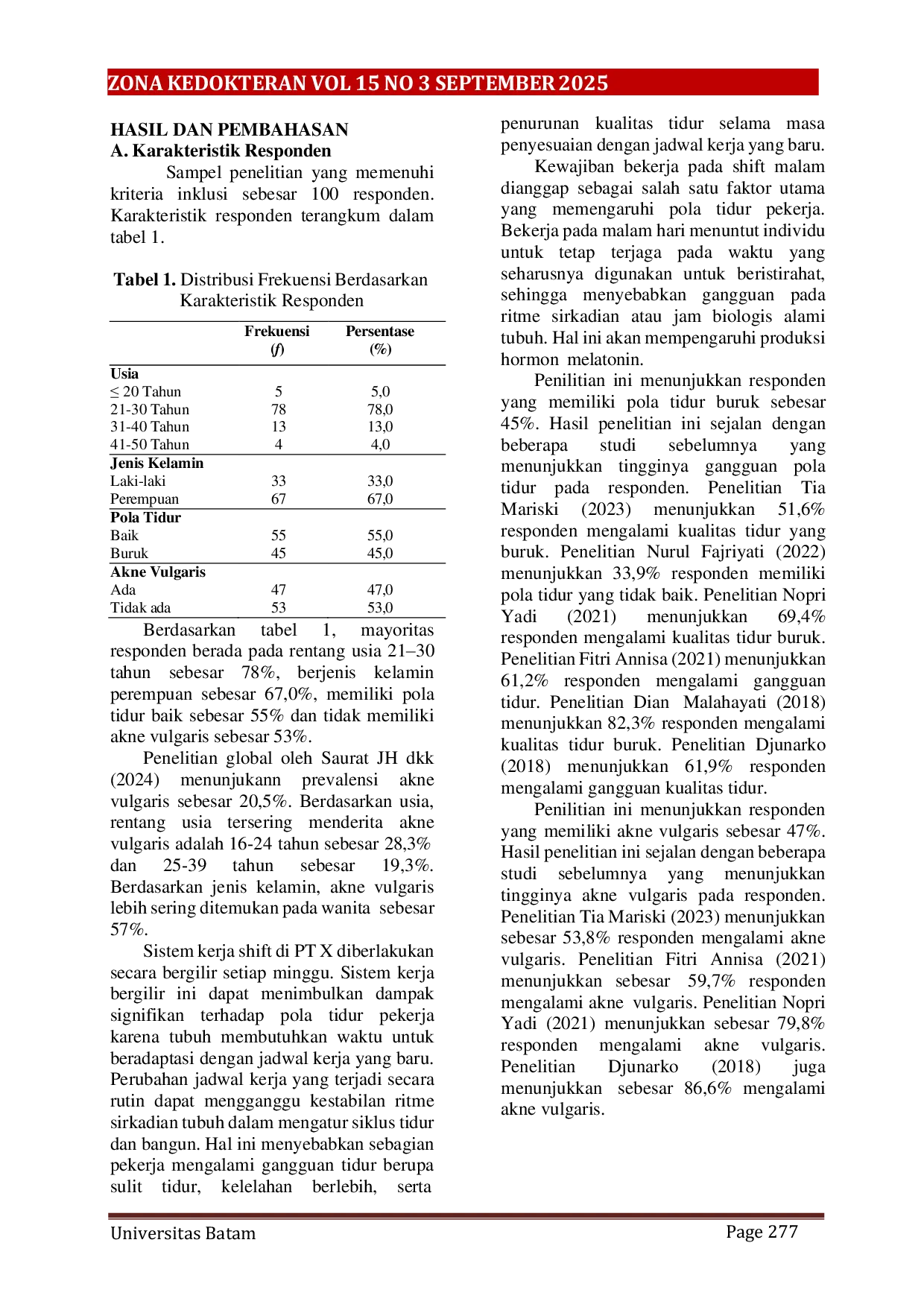 Zona Kedokteran: Program Studi Pendidikan Dokter Universitas BatamZona Kedokteran: Program Studi Pendidikan Dokter Universitas BatamAkne vulgaris adalah penyakit kulit yang umum terjadi pada unit pilosebasea dan dipengaruhi oleh berbagai faktor, termasuk pola tidur. Pola tidur yang buruk dapat menurunkan hormon melatonin, meningkatkan hormon androgen, sehingga memicu produksi sebum berlebih dan timbulnya akne vulgaris.
