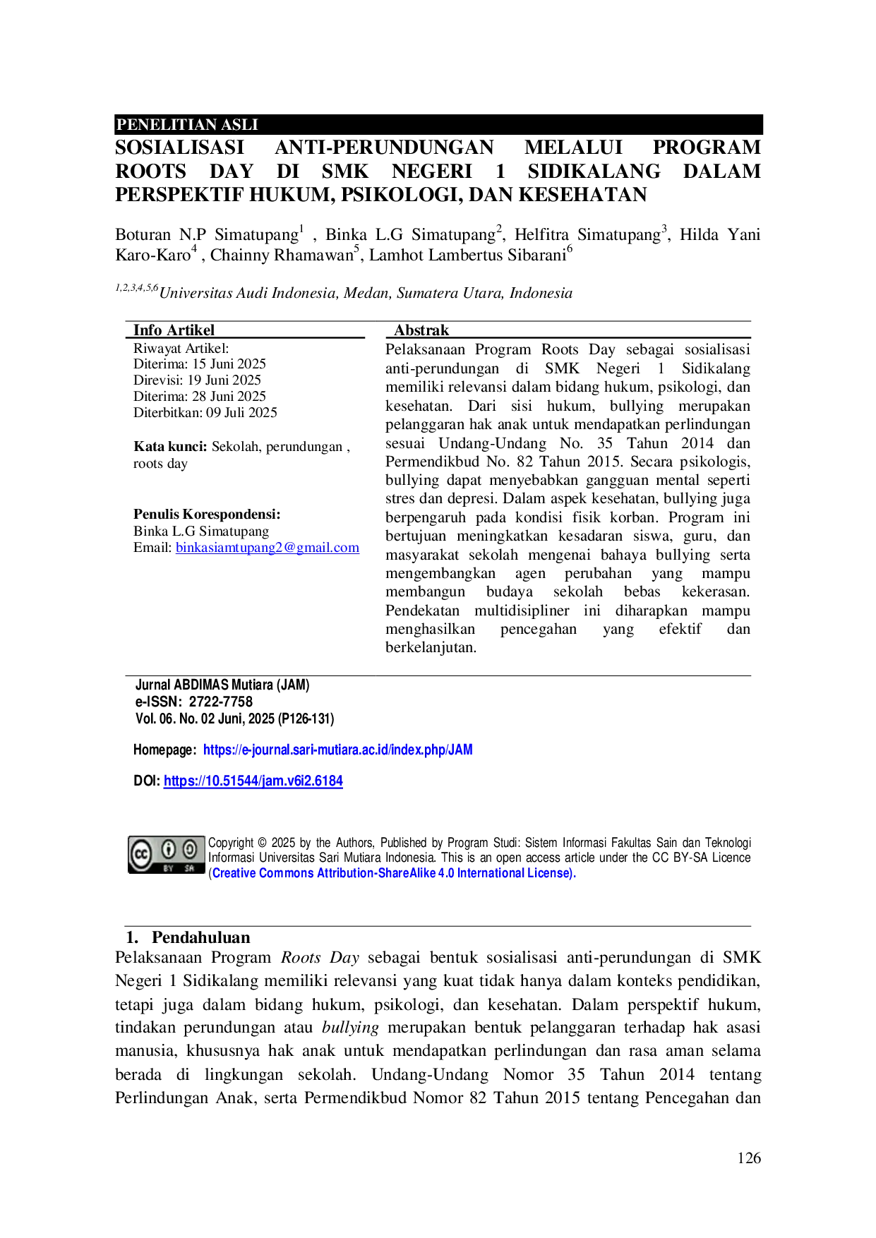 Jurnal Abdimas MutiaraJurnal Abdimas MutiaraPelaksanaan Program Roots Day sebagai sosialisasi anti-perundungan di SMK Negeri 1 Sidikalang memiliki relevansi dalam bidang hukum, psikologi, dan kesehatan. Dari sisi hukum, bullying merupakan pelanggaran hak anak untuk mendapatkan perlindungan sesuai Undang-Undang No. 35 Tahun 2014 dan Permendikbud No. 82 Tahun 2015.