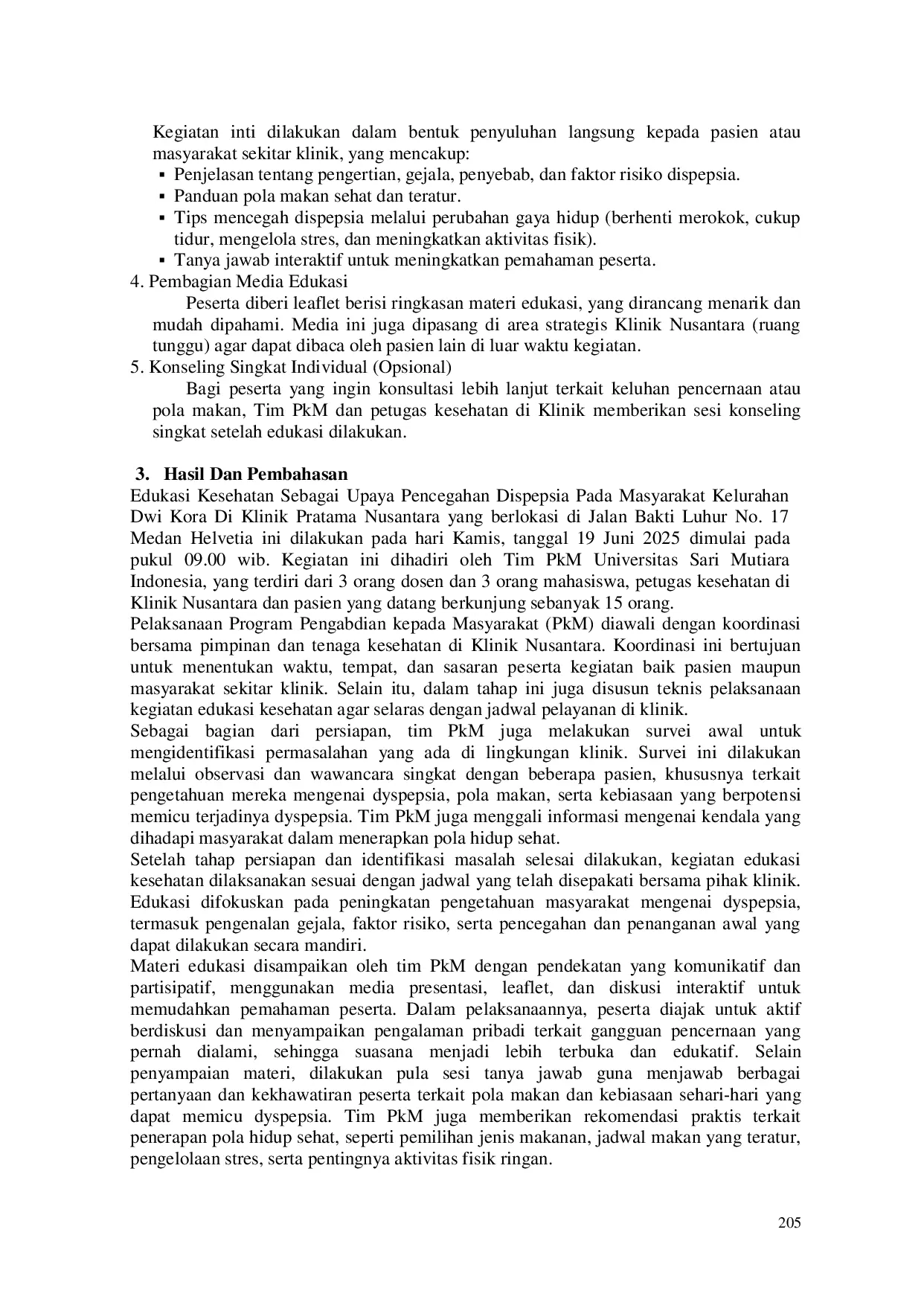 Kegiatan edukasi kesehatan yang dilakukan di Klinik Nusantara Kesehatan terbukti efektif dalam meningkatkan pengetahuan dan kesadaran masyarakat mengenai pencegahan dyspepsia.Melalui penyuluhan interaktif, peserta memperoleh pemahaman yang lebih baik tentang faktor risiko, gejala, serta cara pencegahan dyspepsia melalui pola makan sehat dan gaya hidup yang seimbang.