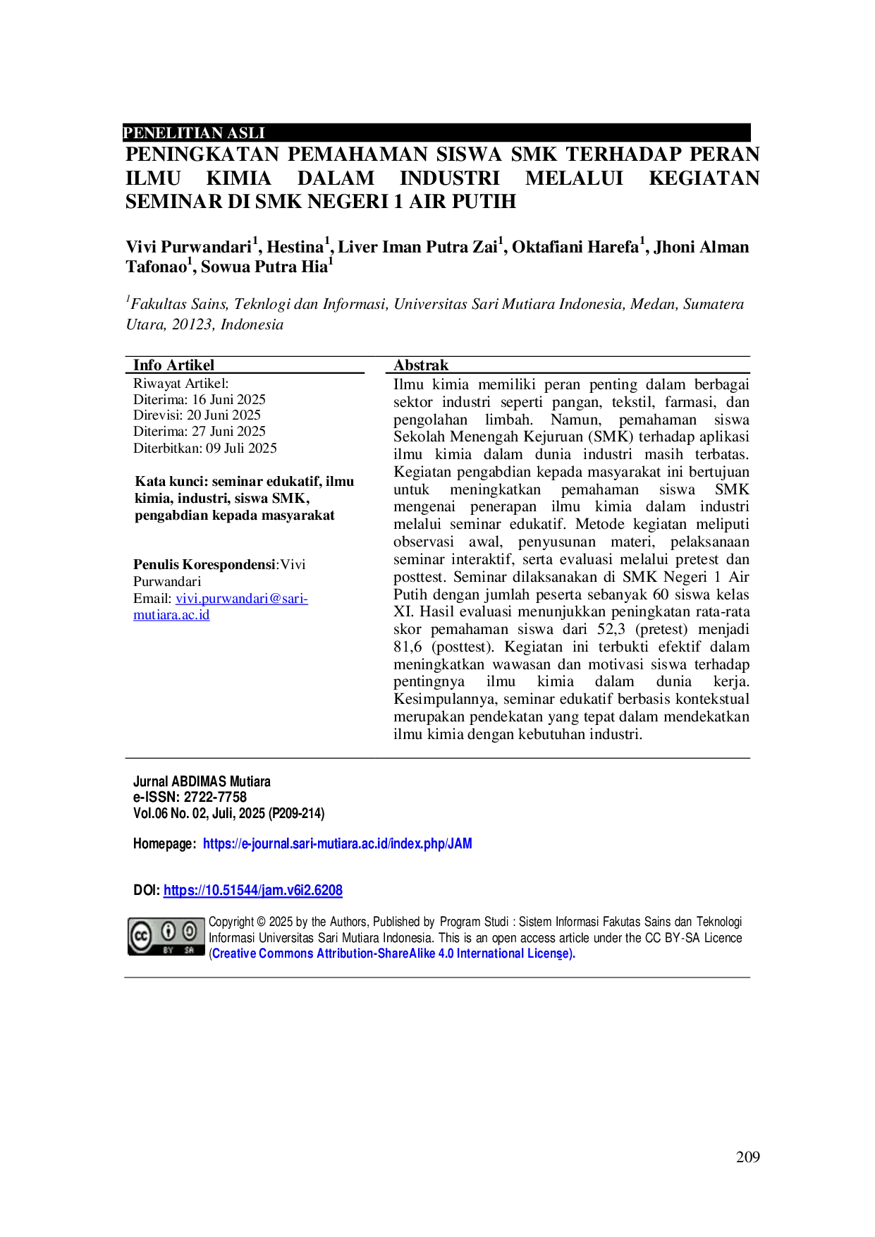 Jurnal Abdimas MutiaraJurnal Abdimas MutiaraIlmu kimia memiliki peran penting dalam berbagai sektor industri seperti pangan, tekstil, farmasi, dan siswa pengolahan Sekolah Menengah Kejuruan (SMK) terhadap aplikasi ilmu kimia dalam dunia industri masih terbatas. Kegiatan pengabdian kepada masyarakat ini bertujuan siswa SMK untuk meningkatkan pemahaman mengenai penerapan industri melalui seminar edukatif. Metode kegiatan meliputi observasi awal, penyusunan materi, pelaksanaan seminar interaktif, serta evaluasi melalui pretest dan posttest. Seminar dilaksanakan di SMK Negeri 1 Air Putih dengan jumlah peserta sebanyak 60 siswa kelas XI. Hasil evaluasi menunjukkan peningkatan rata-rata skor pemahaman siswa dari 52,3 (pretest) menjadi 81,6 (posttest). Kegiatan ini terbukti efektif dalam meningkatkan wawasan dan motivasi siswa terhadap pentingnya kerja. Kesimpulannya, seminar edukatif berbasis kontekstual merupakan pendekatan yang tepat dalam mendekatkan ilmu kimia dengan kebutuhan industri.